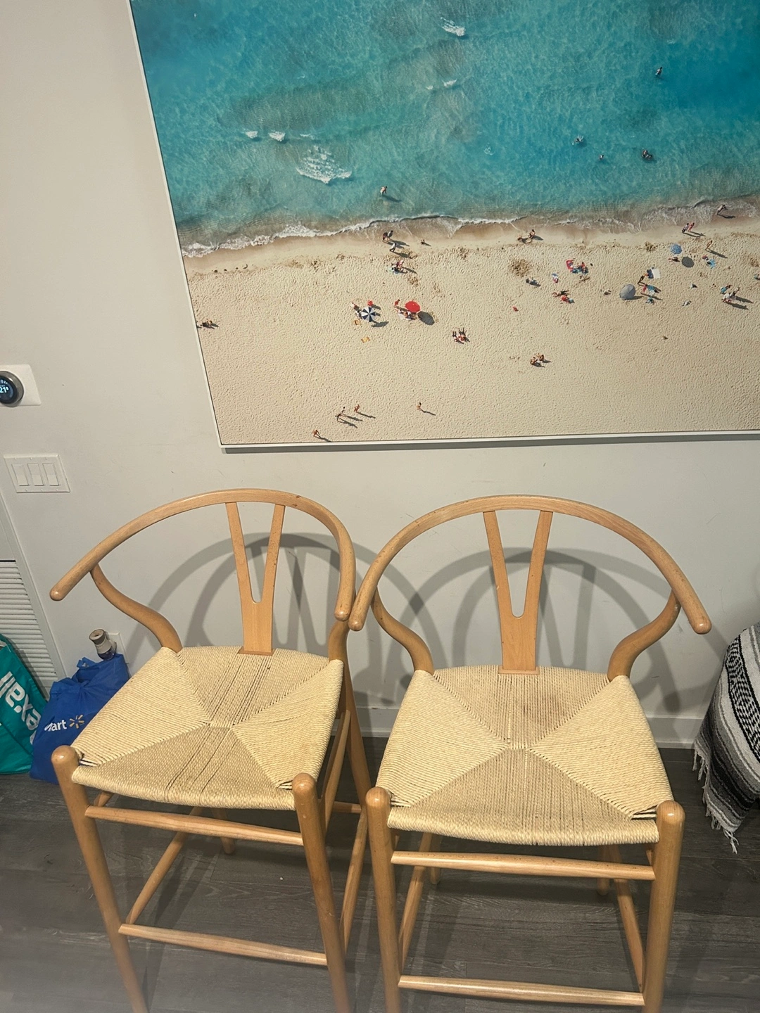 Two light wood bar stools. Natural woven seats. Simple design. Excellent for a kitchen island or bar area. Approximately 112cm tall.
