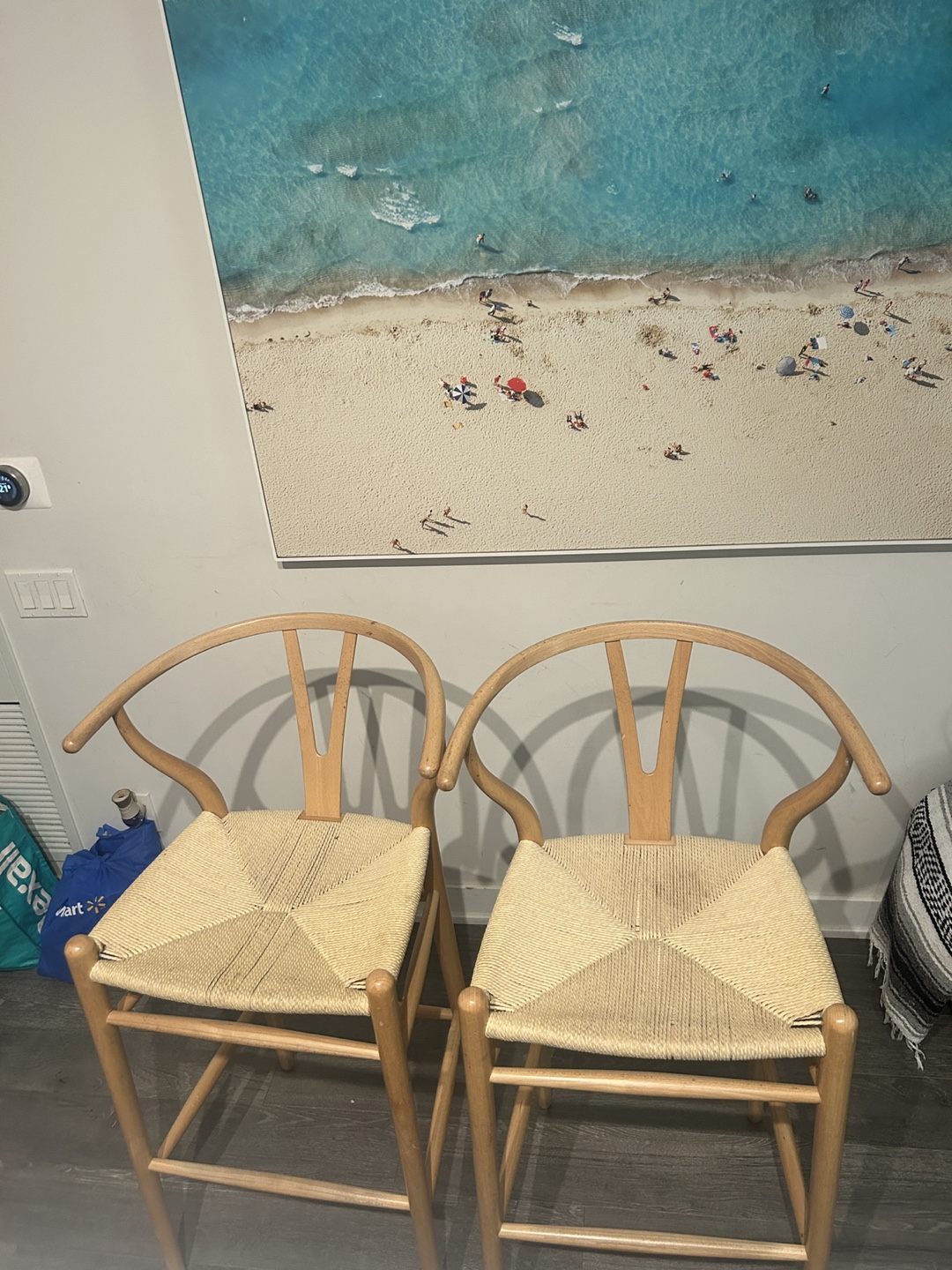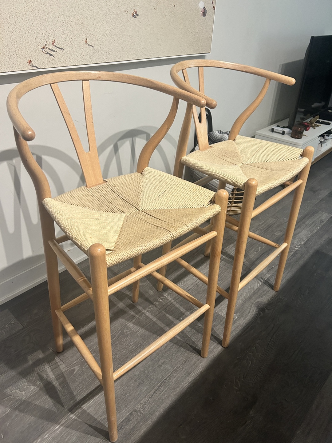 Two light wood bar stools. Natural woven seats. Simple design. Excellent for a kitchen island or bar area. Approximately 112cm tall.