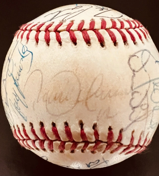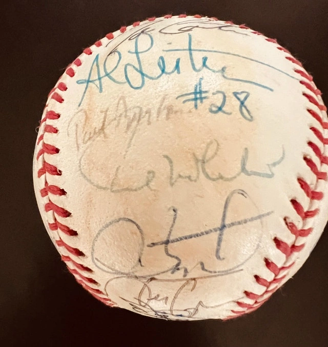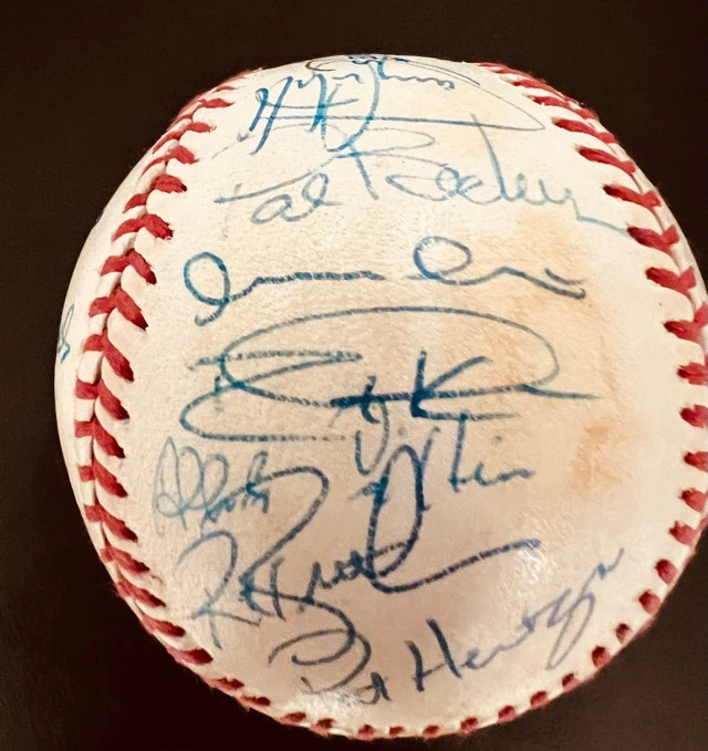 1993 Toronto Blue Jays Autographed World Series Ball with 23 signatures. No COA, but every autograph was signed in my presence. Blue Jay fans will readily recognize the signatures. A few signatures have started to fade and there is some ball discolouration which attests to the age of the ball and adds to the provenance. The ball has the rare signatures of the architects of the WS team COO, Paul Beeston and GM, Pat Gillick. Signatures include: Woody Williams, Dan Cox #50, John Olerud, Devon White, Roberto Alomar, Darnell Coles #11, Ed Sprague #16, Nick Leyva, Cito Gaston, Tony Fernandez, Tony Castillo, Pat Borders, Luis Soho, Randy Knorr, Alfredo Griffin, Rob Butler, Pat Hentgen, Pat Gillick, Alan Leiter #28, Paul Beeston, Paul Molitor, Dave Stewart, David Cone. Please check out my listing for a 1992 World Series Ball with 20 signatures. Pick up in north west Burlington. Sold by Grandson & Grandad Sports Collectibles.