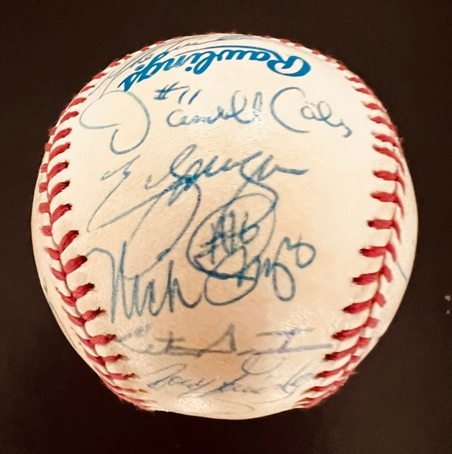 1993 Toronto Blue Jays Autographed World Series Ball with 23 signatures. No COA, but every autograph was signed in my presence. Blue Jay fans will readily recognize the signatures. A few signatures have started to fade and there is some ball discolouration which attests to the age of the ball and adds to the provenance. The ball has the rare signatures of the architects of the WS team COO, Paul Beeston and GM, Pat Gillick. Signatures include: Woody Williams, Dan Cox #50, John Olerud, Devon White, Roberto Alomar, Darnell Coles #11, Ed Sprague #16, Nick Leyva, Cito Gaston, Tony Fernandez, Tony Castillo, Pat Borders, Luis Soho, Randy Knorr, Alfredo Griffin, Rob Butler, Pat Hentgen, Pat Gillick, Alan Leiter #28, Paul Beeston, Paul Molitor, Dave Stewart, David Cone. Please check out my listing for a 1992 World Series Ball with 20 signatures. Pick up in north west Burlington. Sold by Grandson & Grandad Sports Collectibles.