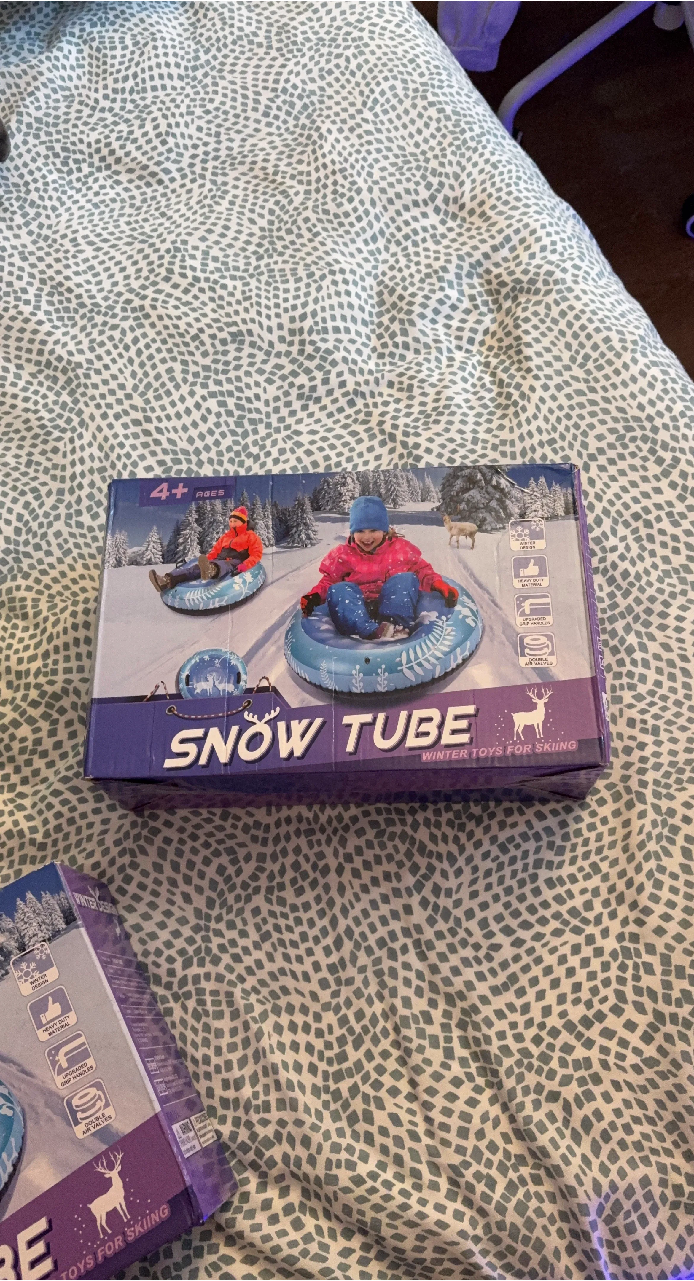 This snow tube is designed for winter fun! It's made with heavy-duty material and features upgraded grip handles for secure use. It also has double air valves for easy inflation and deflation. Recommended for ages 4 and up.