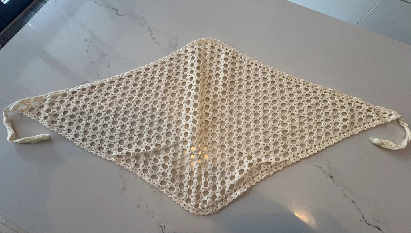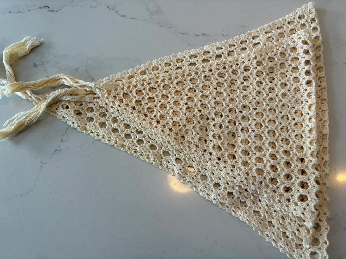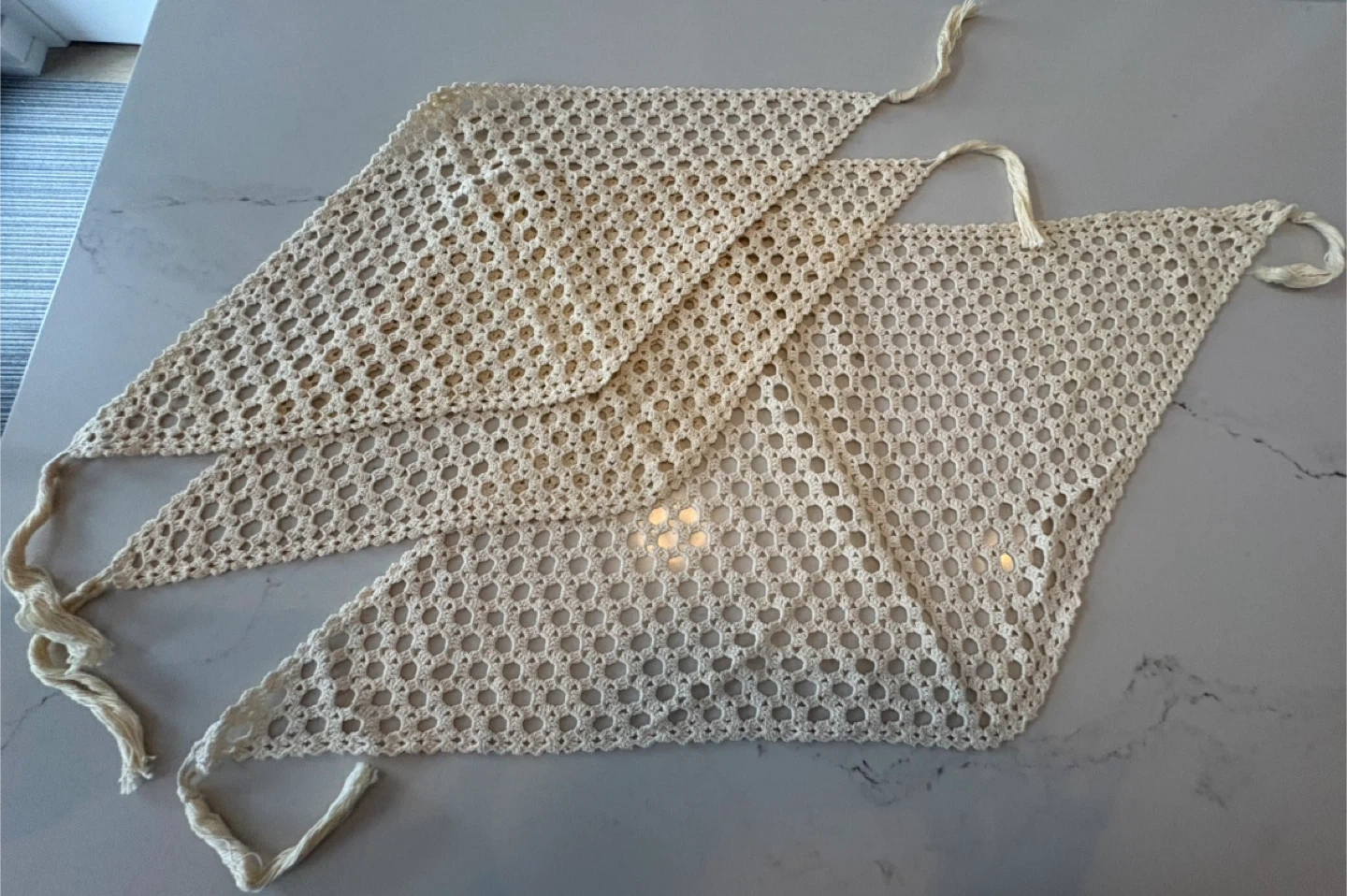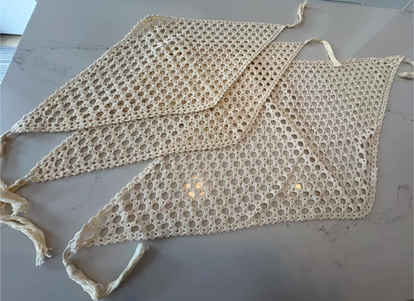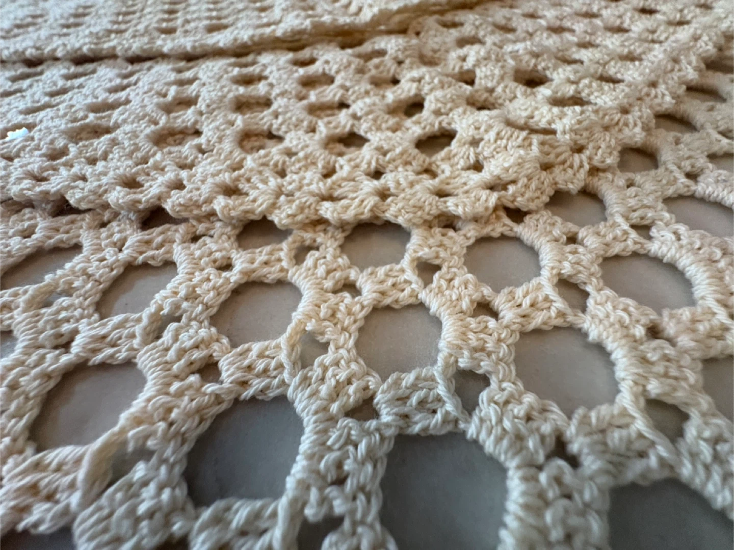 Charming vintage handmade ecru / buttery beige diamond shape crochet lace doilies or table runners with tassels - 3 piece set.