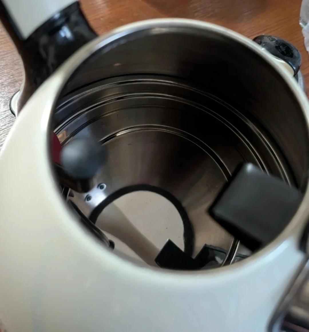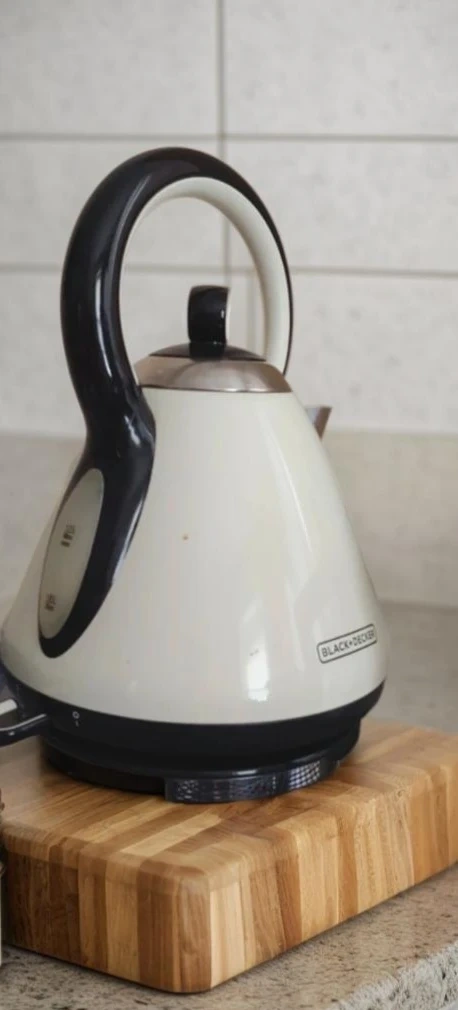 🥕This is a Black+Decker electric kettle. It's cream and black with a large handle. The capacity is 1.7 liters. It has a water level indicator. It's used but in great condition.