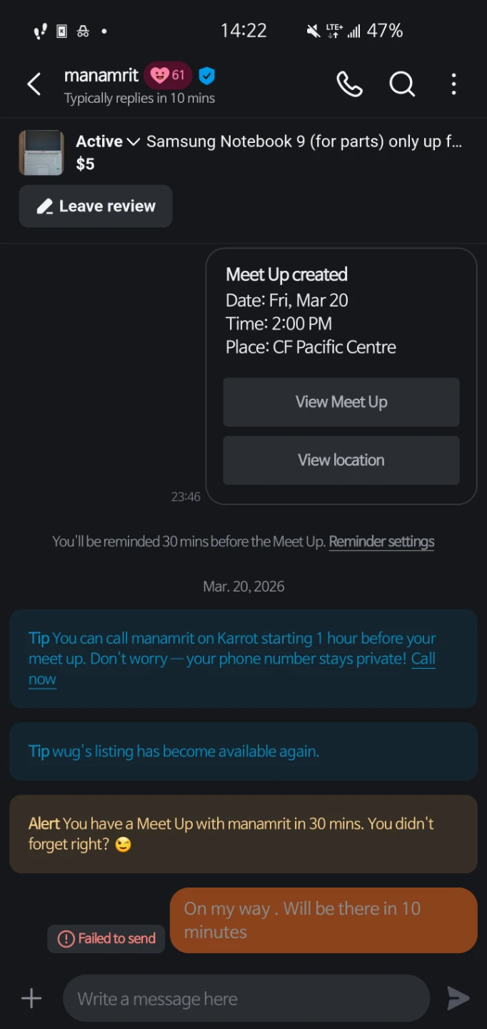 Just don't be a jerk. Don't be like manamrit https://ca.karrotmarket.com/u/AkBj75g8AqNZ6K5e who blocks the counterpart 10 minutes before meetup without saying.