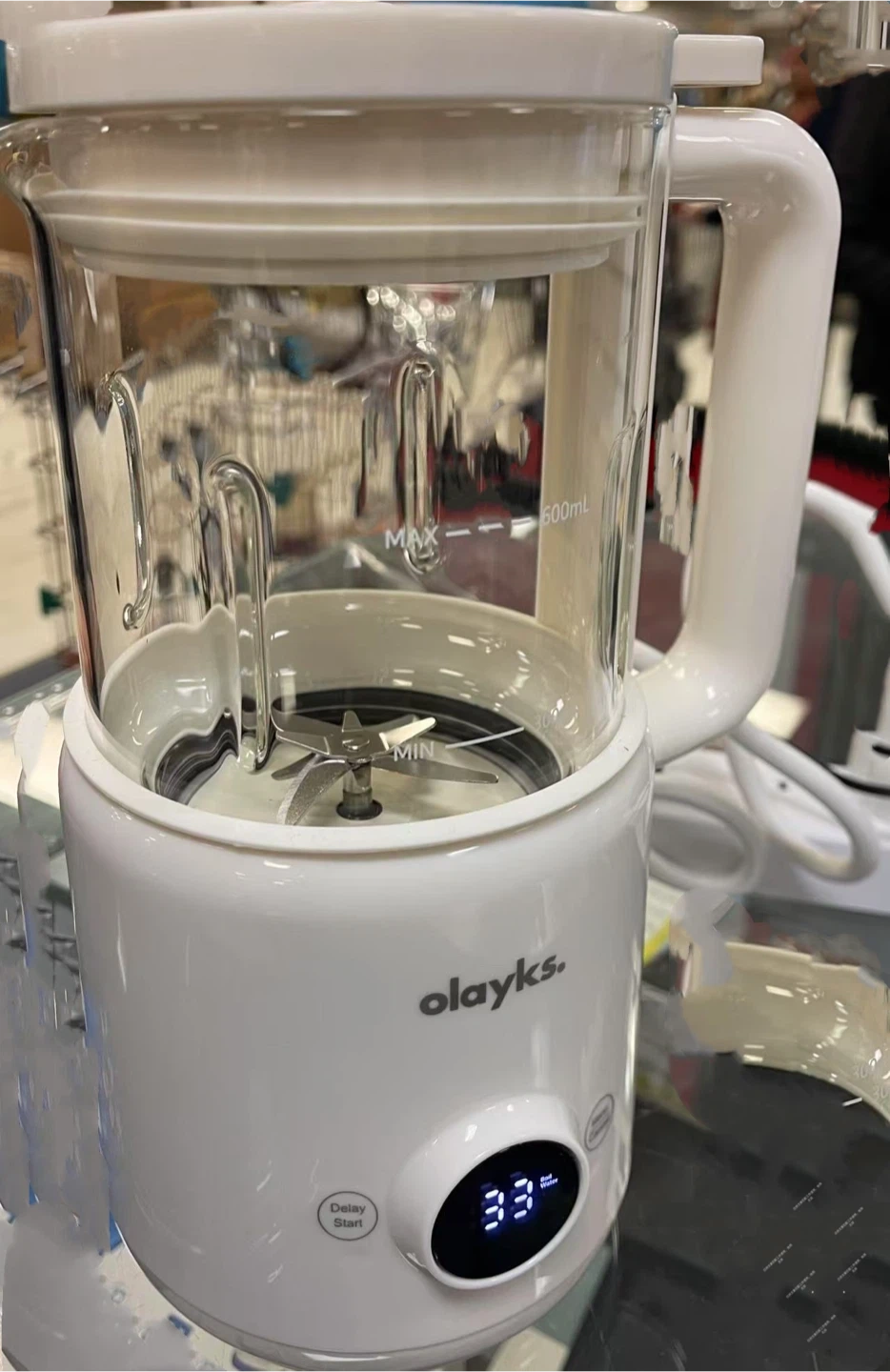 This is an Olayks blender with a glass jug. It has markings for 500ml and a 'Max' fill line. Features a 'Delay Start' option and a digital display showing '33' and 'End Water'.
