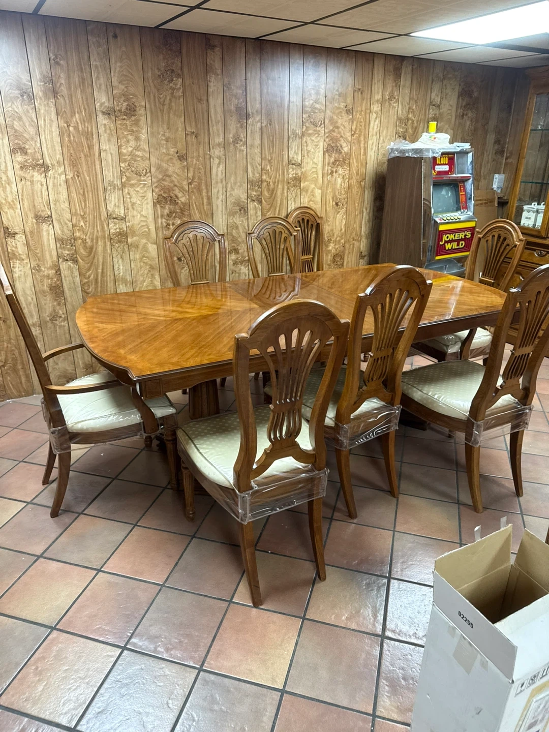 This dining room set includes an oak dining table with 8 cushioned chairs, a china cabinet, and a server buffet. The set is perfect for seating 8 people and has a total of 11 items. Made of oak, this set is perfect for hosting large family dinners or holiday gatherings. The China cabinet provides ample storage space for dishes, while the server buffet offers additional seating and storage for serving food.