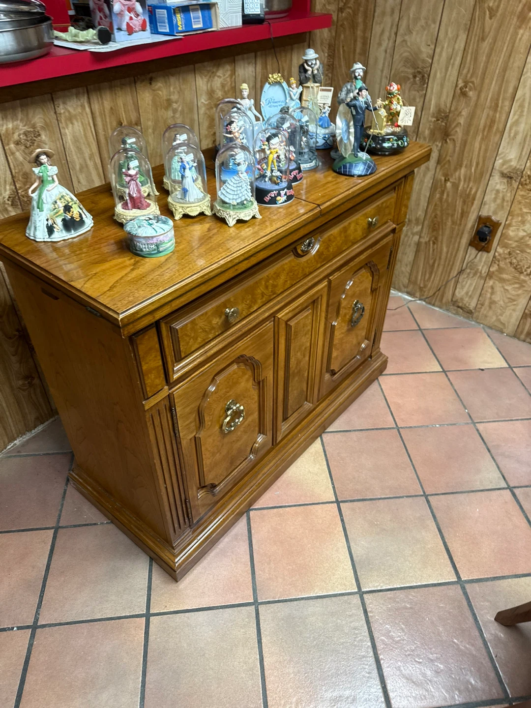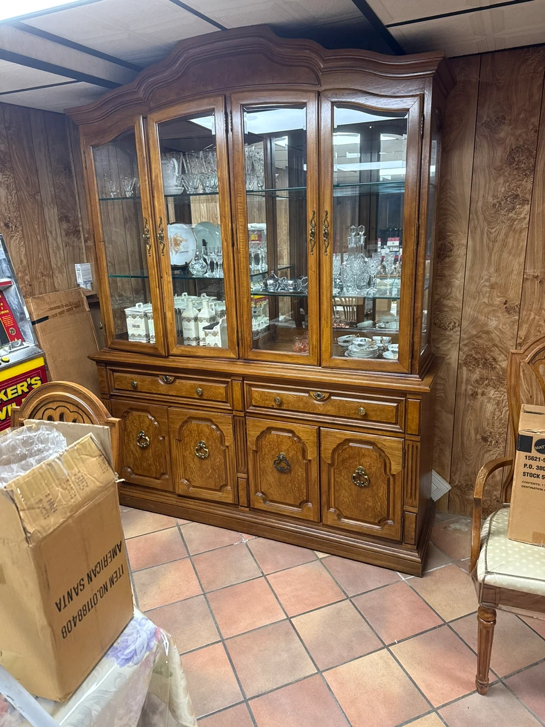 This dining room set includes an oak dining table with 8 cushioned chairs, a china cabinet, and a server buffet. The set is perfect for seating 8 people and has a total of 11 items. Made of oak, this set is perfect for hosting large family dinners or holiday gatherings. The China cabinet provides ample storage space for dishes, while the server buffet offers additional seating and storage for serving food.