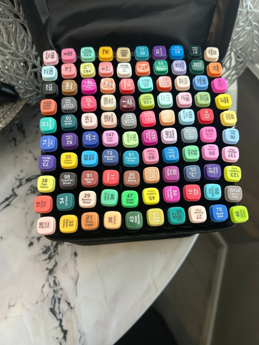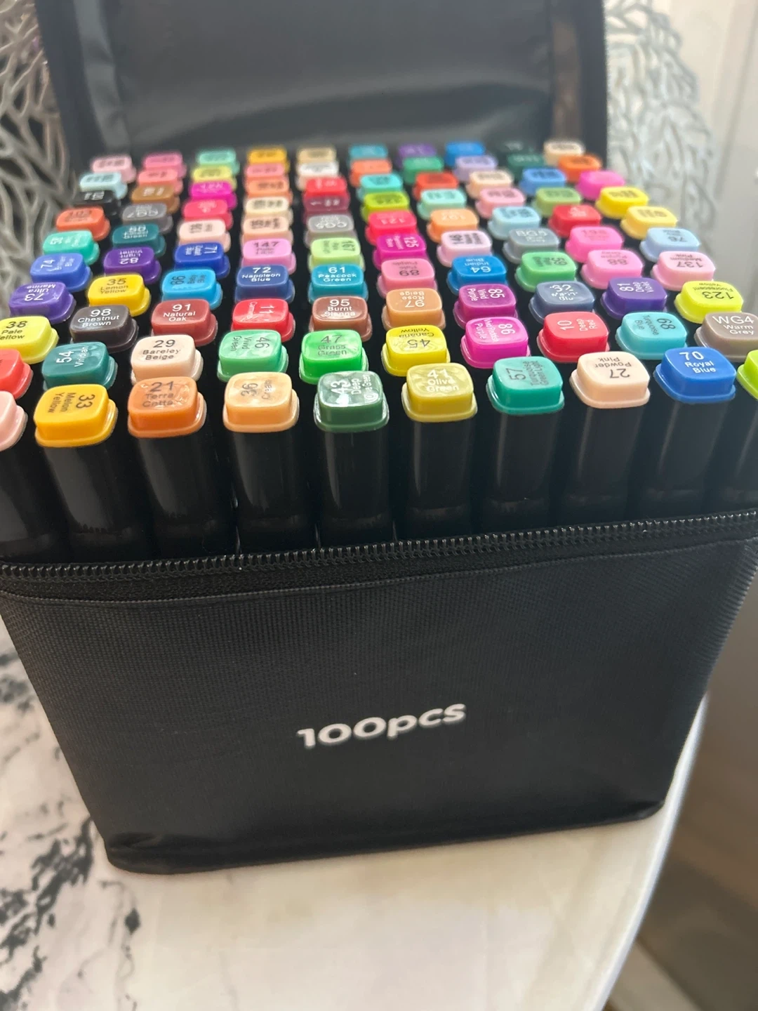 This set includes 100 coloured twin markers in a black carrying case. Each marker features a fine tip and a broad tip for versatile use. The case is labelled '100pcs' and the markers are organized by colour and number. Asking $40 obo. They are brand new in the case, never used.