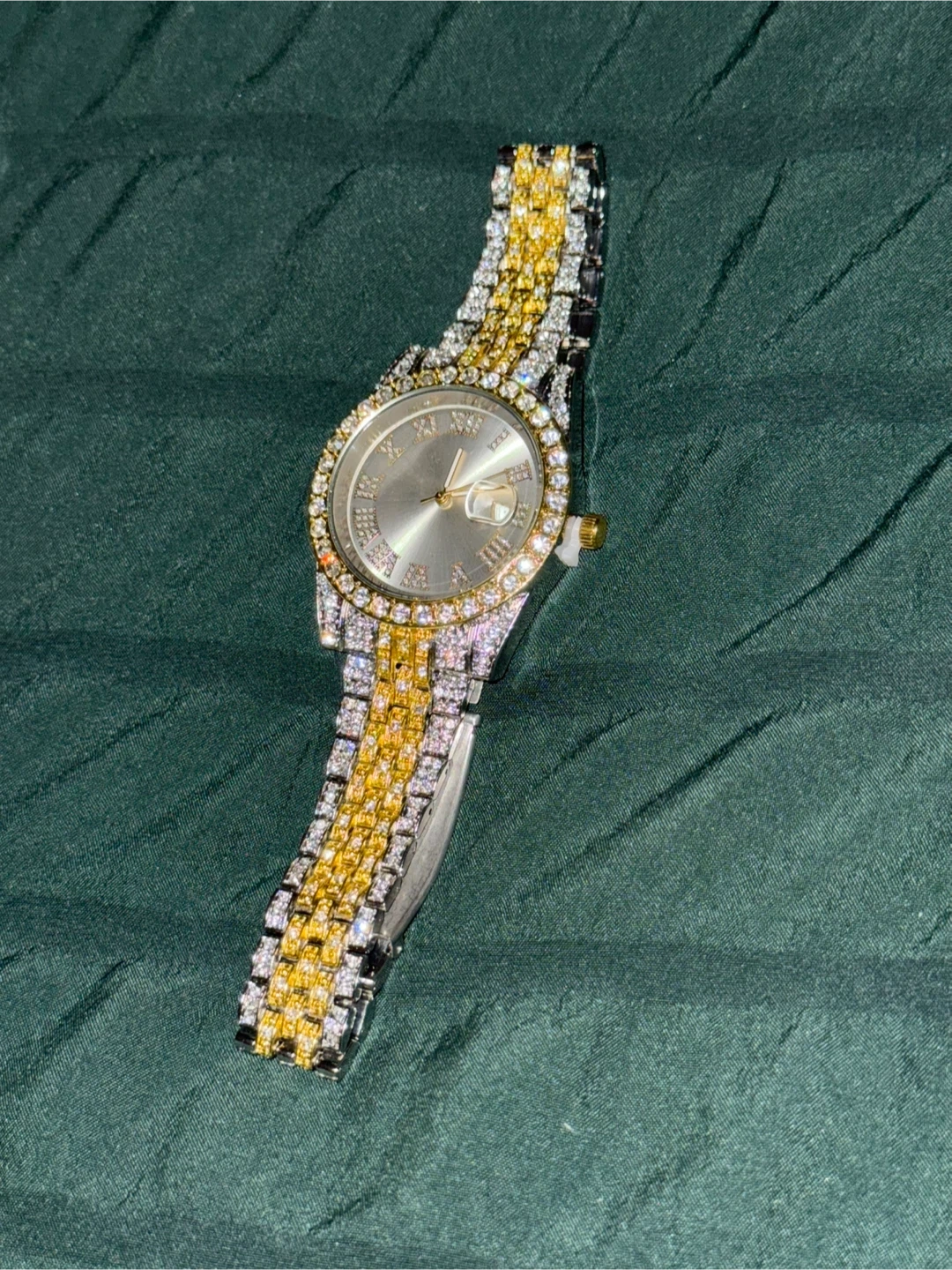 This watch features a sparkly band with gold and silver tones. It has a classic silver face with Roman numerals and a date window. It's a stylish accessory for any occasion!