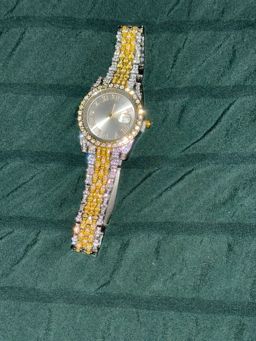 This watch features a sparkly band with gold and silver tones. It has a classic silver face with Roman numerals and a date window. It's a stylish accessory for any occasion!