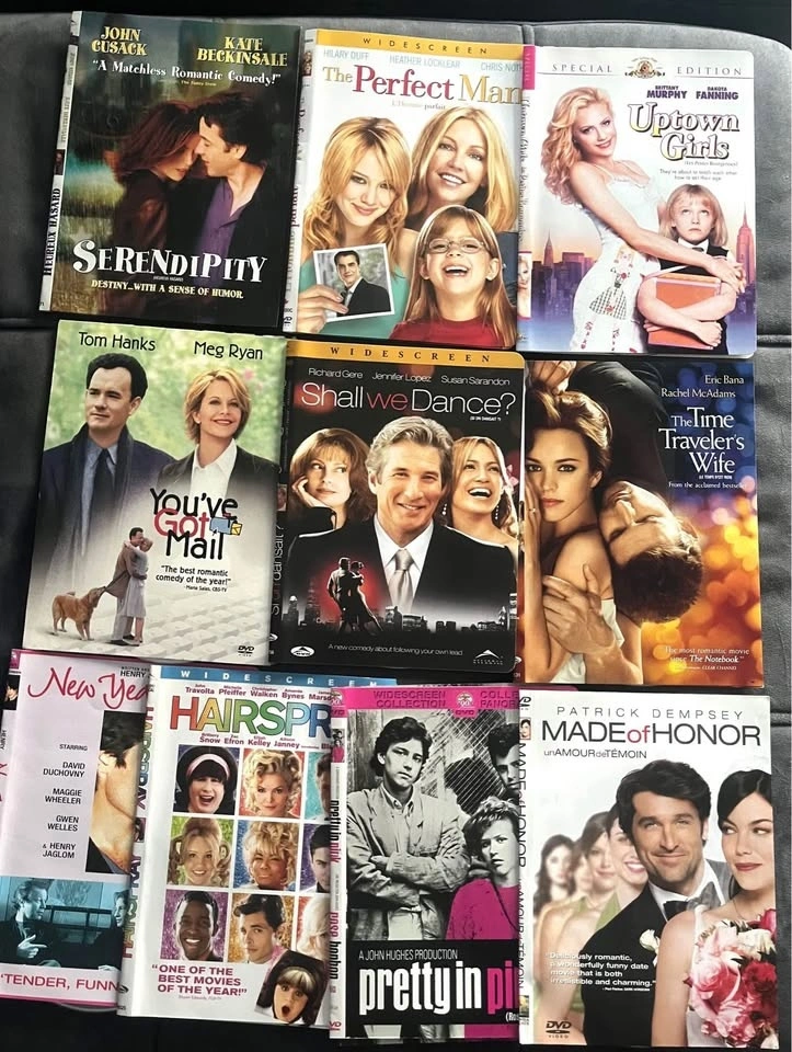 All original cover art and discs are included. Does not come with plastic cases. Includes: Serendipity, The Perfect Man, Uptown Girls, You’ve Got Mail, Shall We Dance, The Time Travellers Wife, New Years Day, Hairspray, Pretty in Pink, Made of Honor. From a smoke free home. Pick up in Ajax near Westney/Rossland.