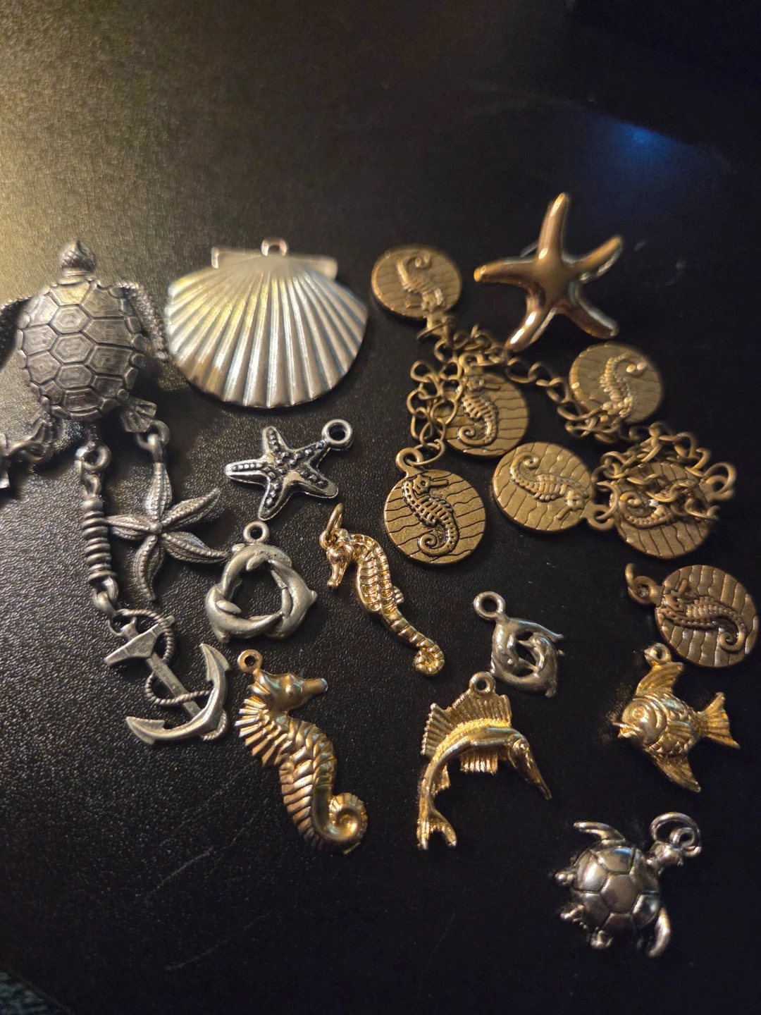 Collection of various metal charms with nautical themes, including seahorses, sea turtles, fish, starfish, shells and anchors. Charms are made from mixed metals with gold and silver tones. Perfect for crafting or adding to bracelets and necklaces!
