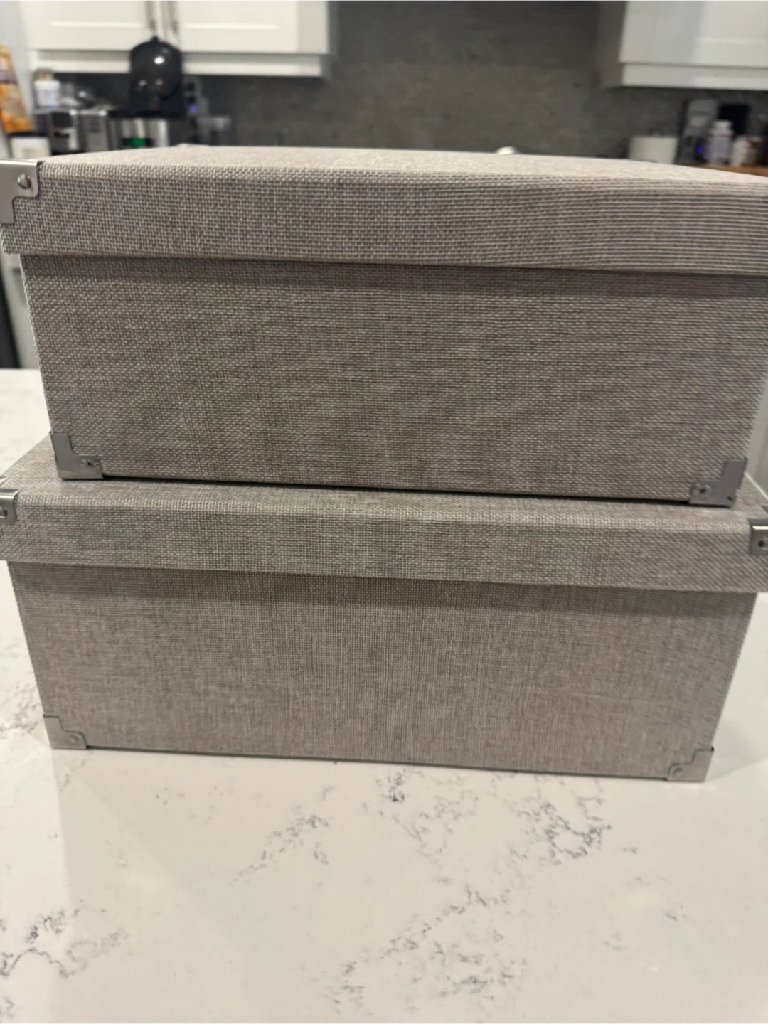 Selling a set of two storage boxes. They're in great shape and perfect for organizing your space. The boxes have a nice neutral colour and a sturdy construction, making them both functional and stylish