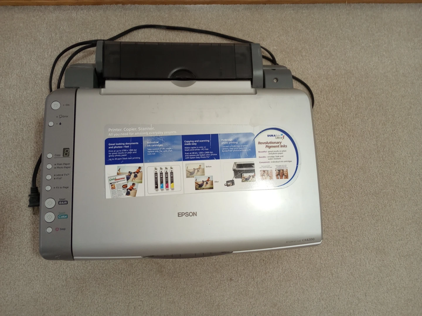This is an Epson CX4200 printer, copier, and scanner. It uses revolutionary pigment inks for great looking documents and photos. It's ideal for everyday tasks, offering individual ink cartridges and borderless printing.