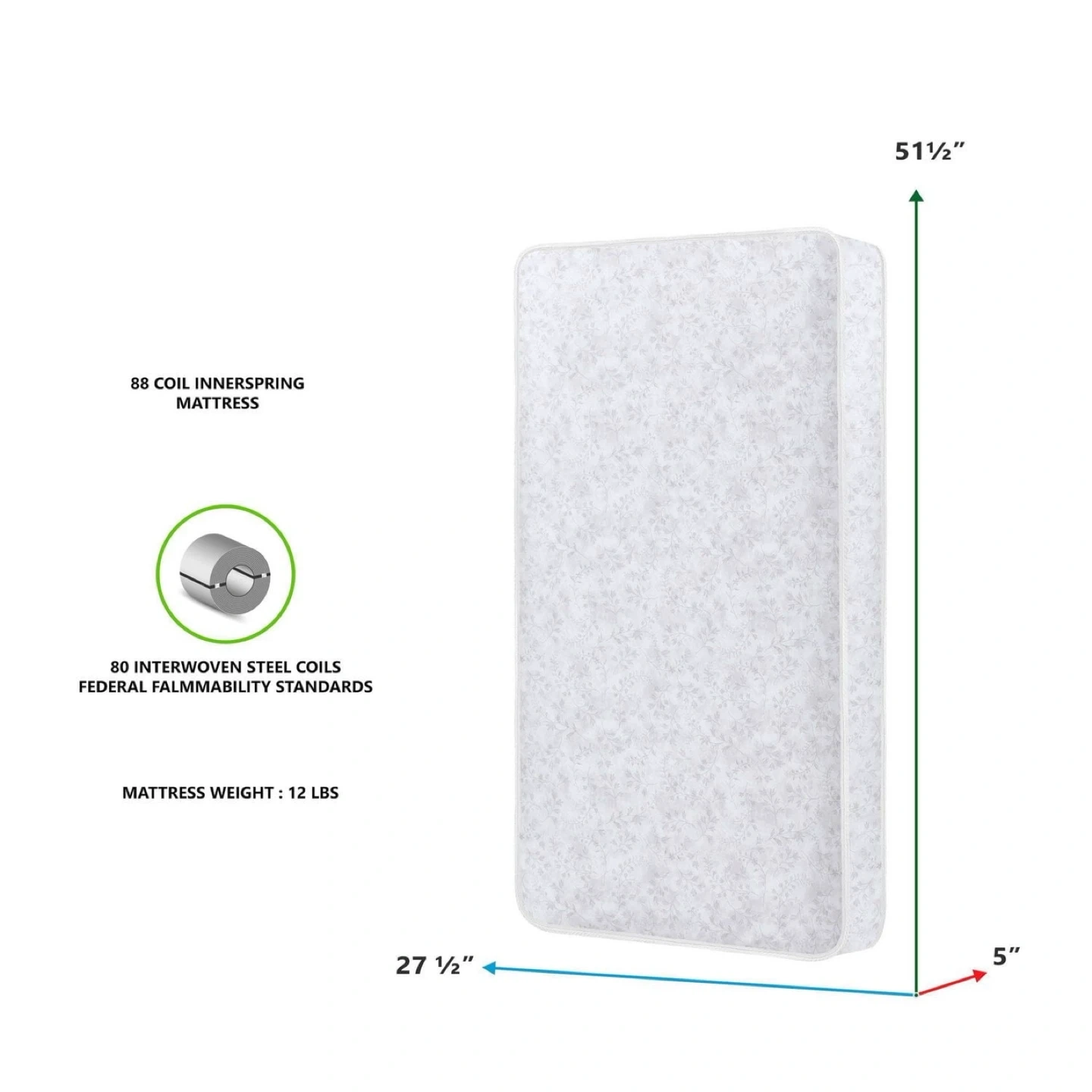 Dream On Me Spring Crib & Toddler Mattress for boys and girls. Features a waterproof tear-resistant cover and 88 inner spring coils. Mattress weight is 12 lbs.
