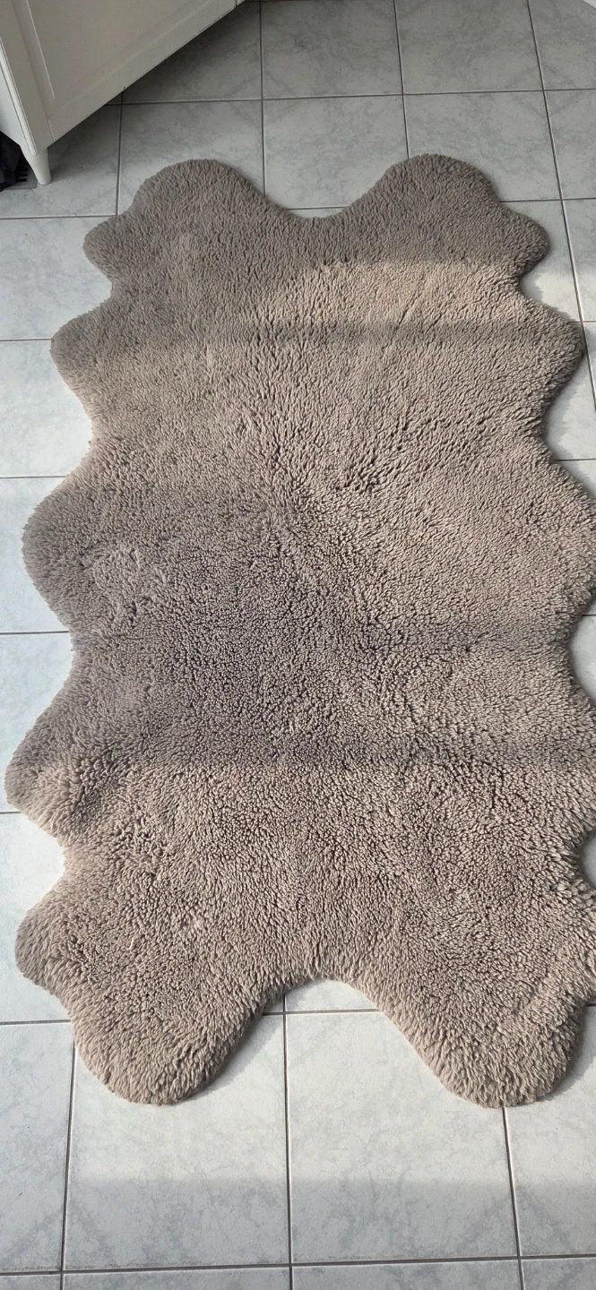 Soft, plush grey rug with a sheepskin-like texture. It's great for adding warmth and comfort to any room. Adds a cosy feel to a bedroom or living area!