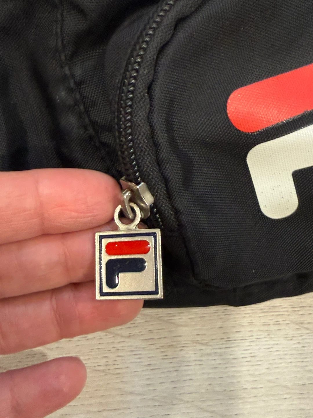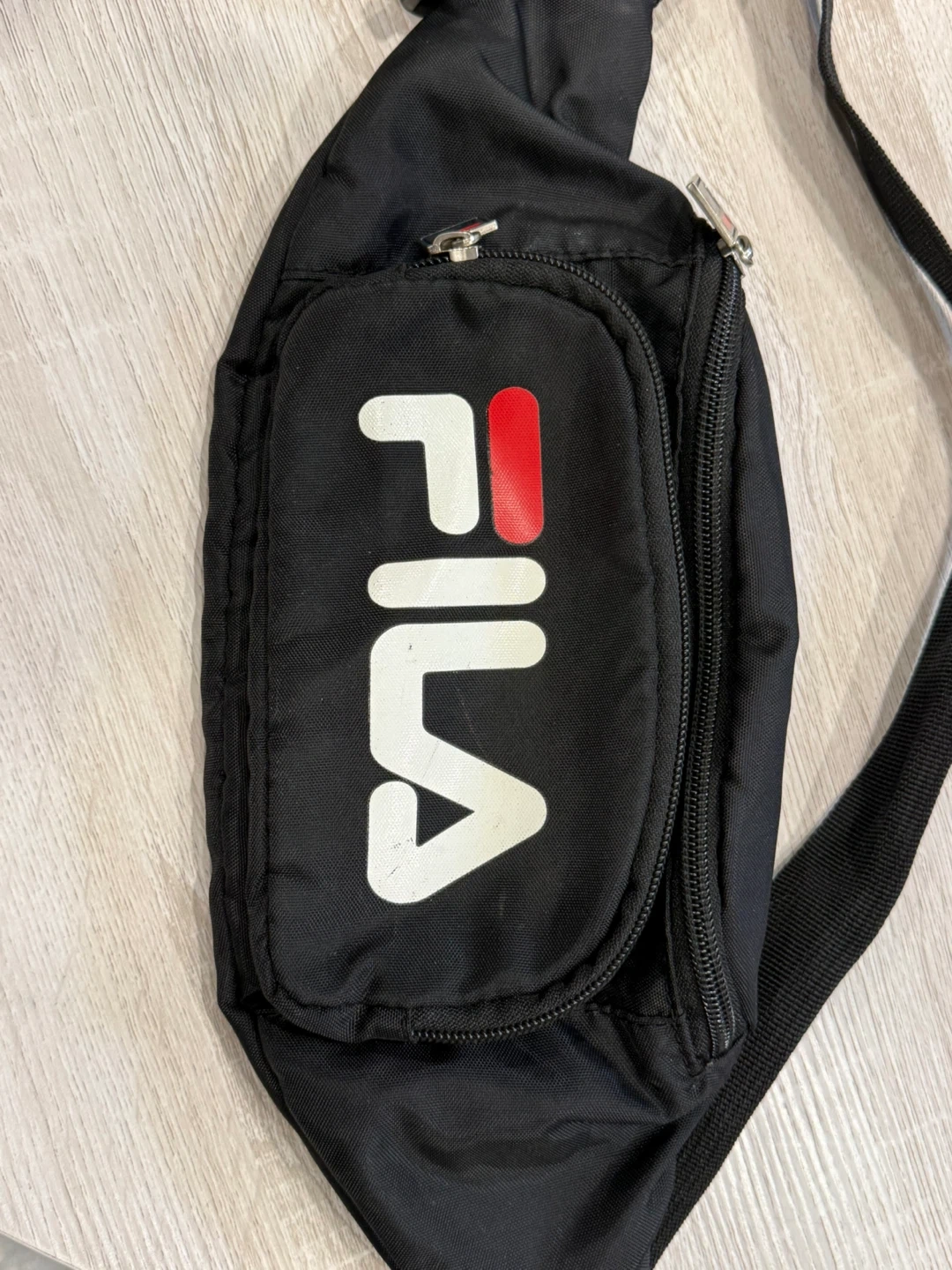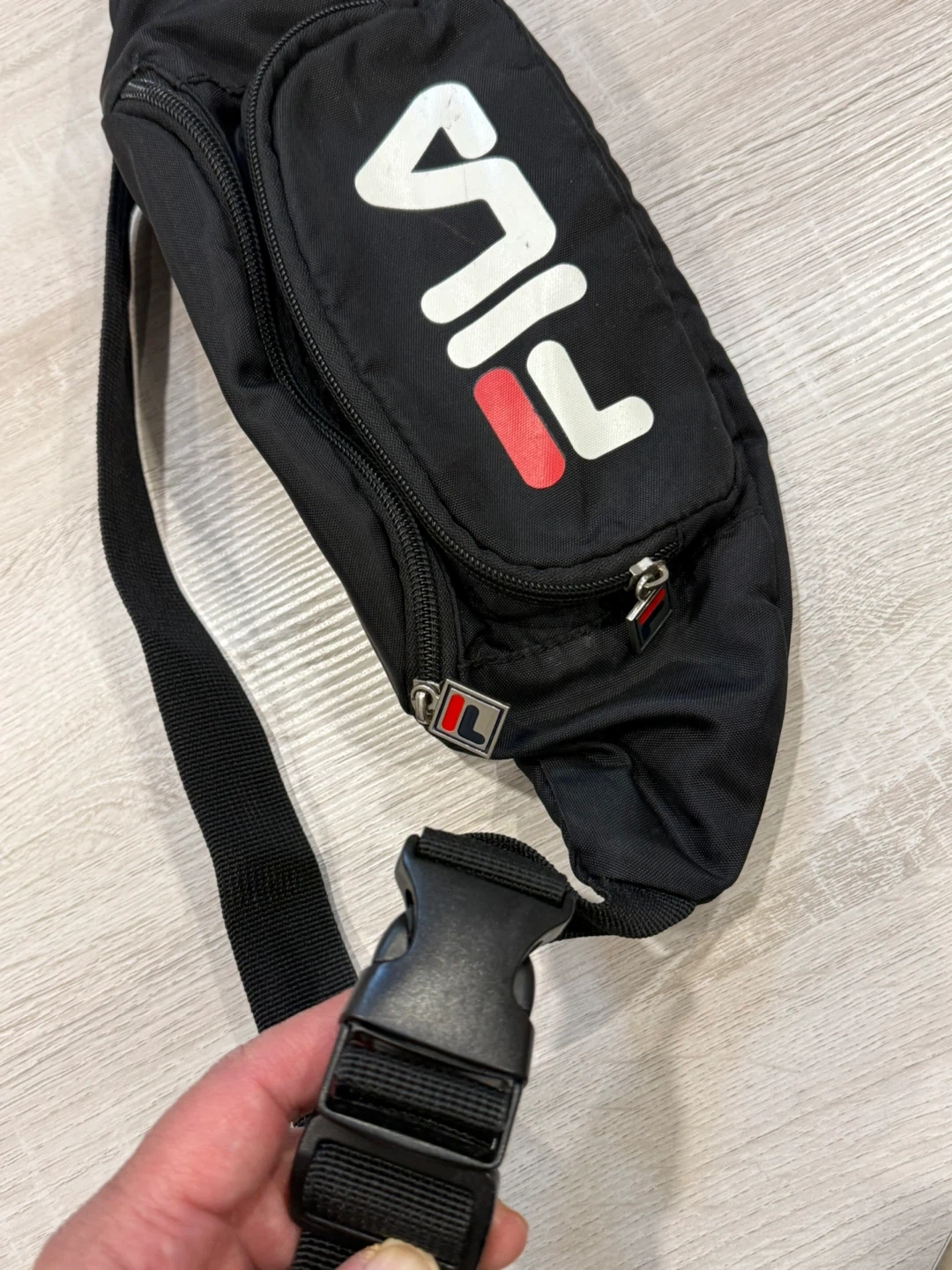 This is a black fanny pack from Fila. It's made of durable material and features a prominent Fila logo. The adjustable strap has a secure buckle. It's great for carrying essentials while on the go!