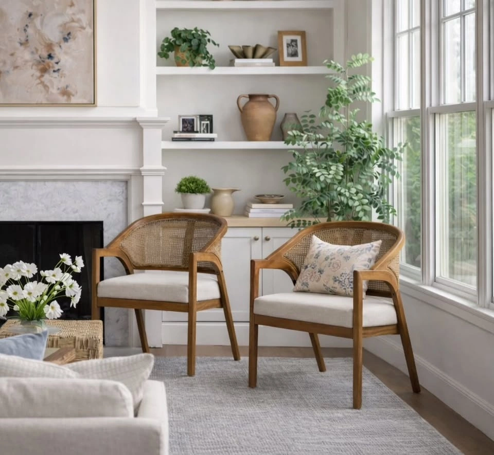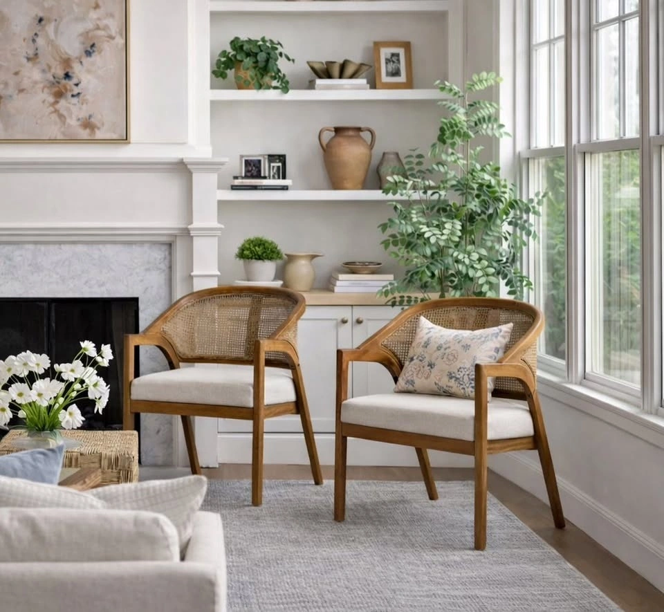 Set of 2 brand new solid wood accent chairs with cane backs. Perfect for a living room or as head/end chairs for a dining table. Price is for the set of 2.