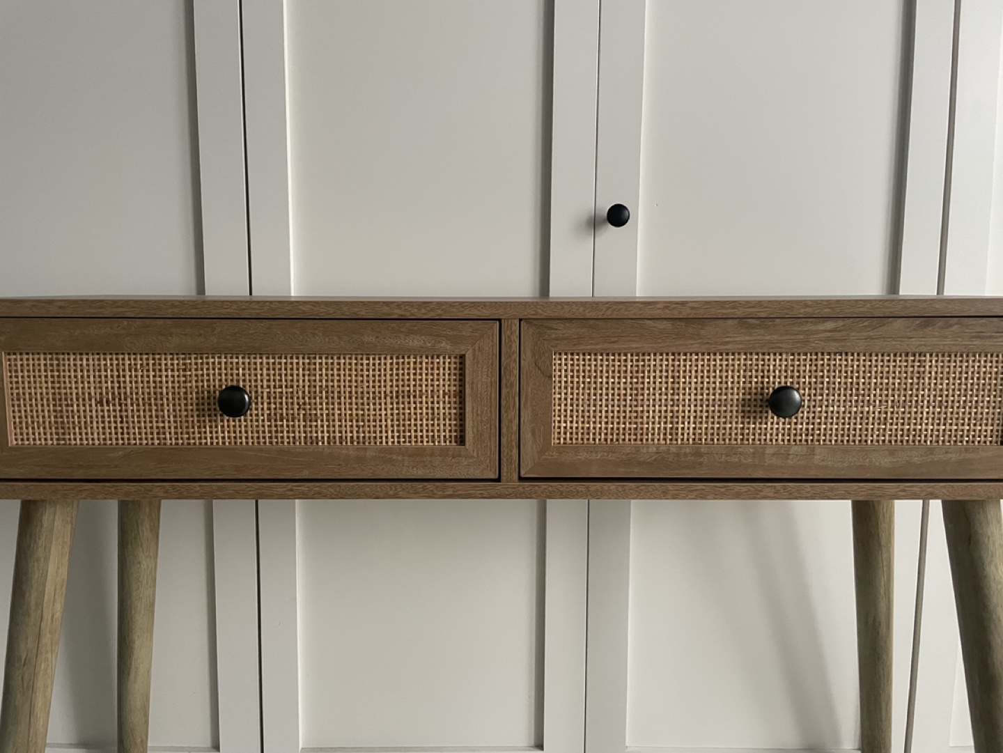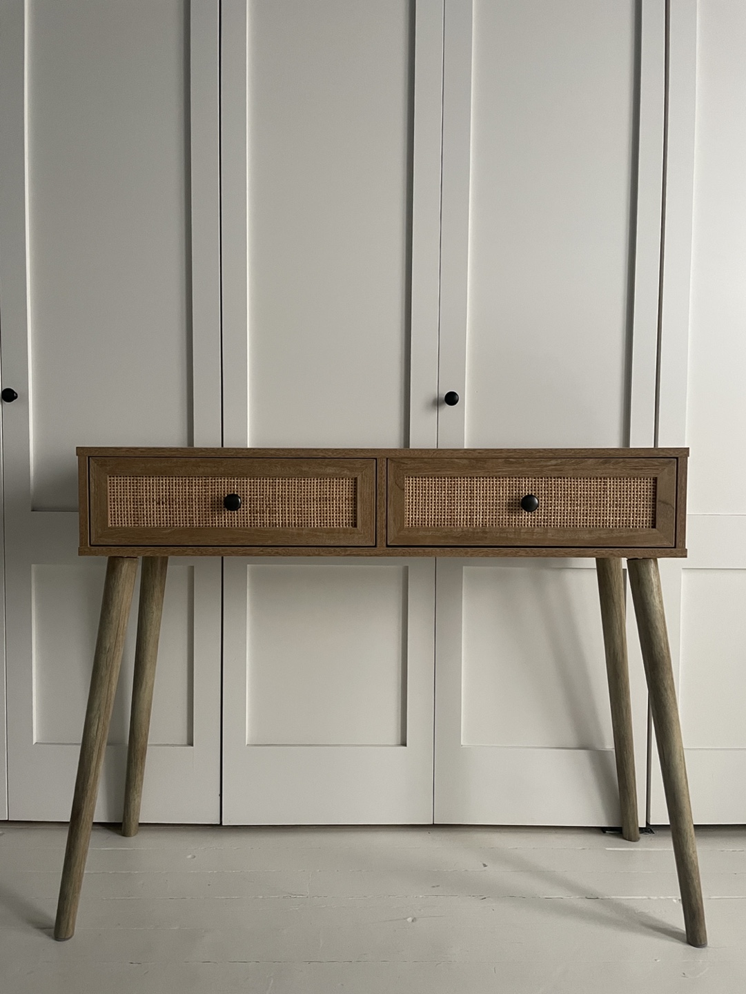 Beautiful console table. Two drawers with woven cane fronts. Light wood finish. Tapered legs. Great for entryway or living room.