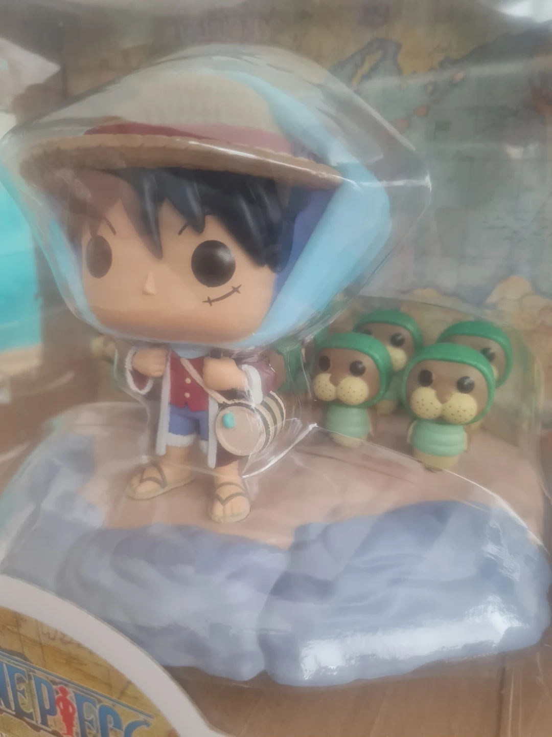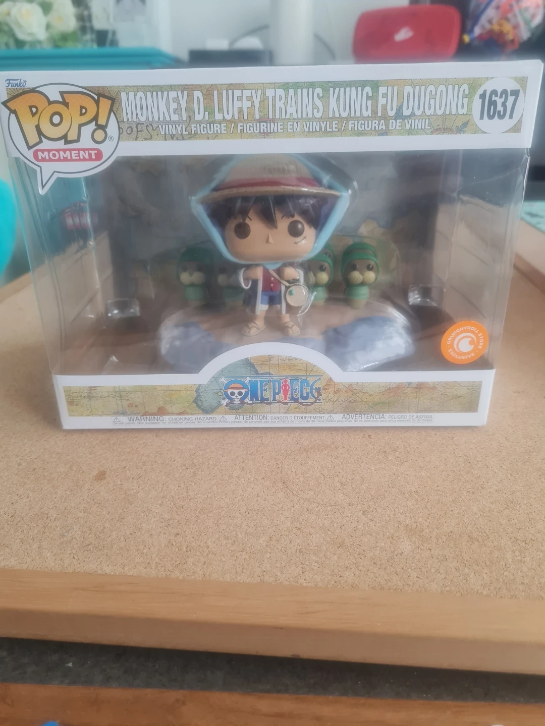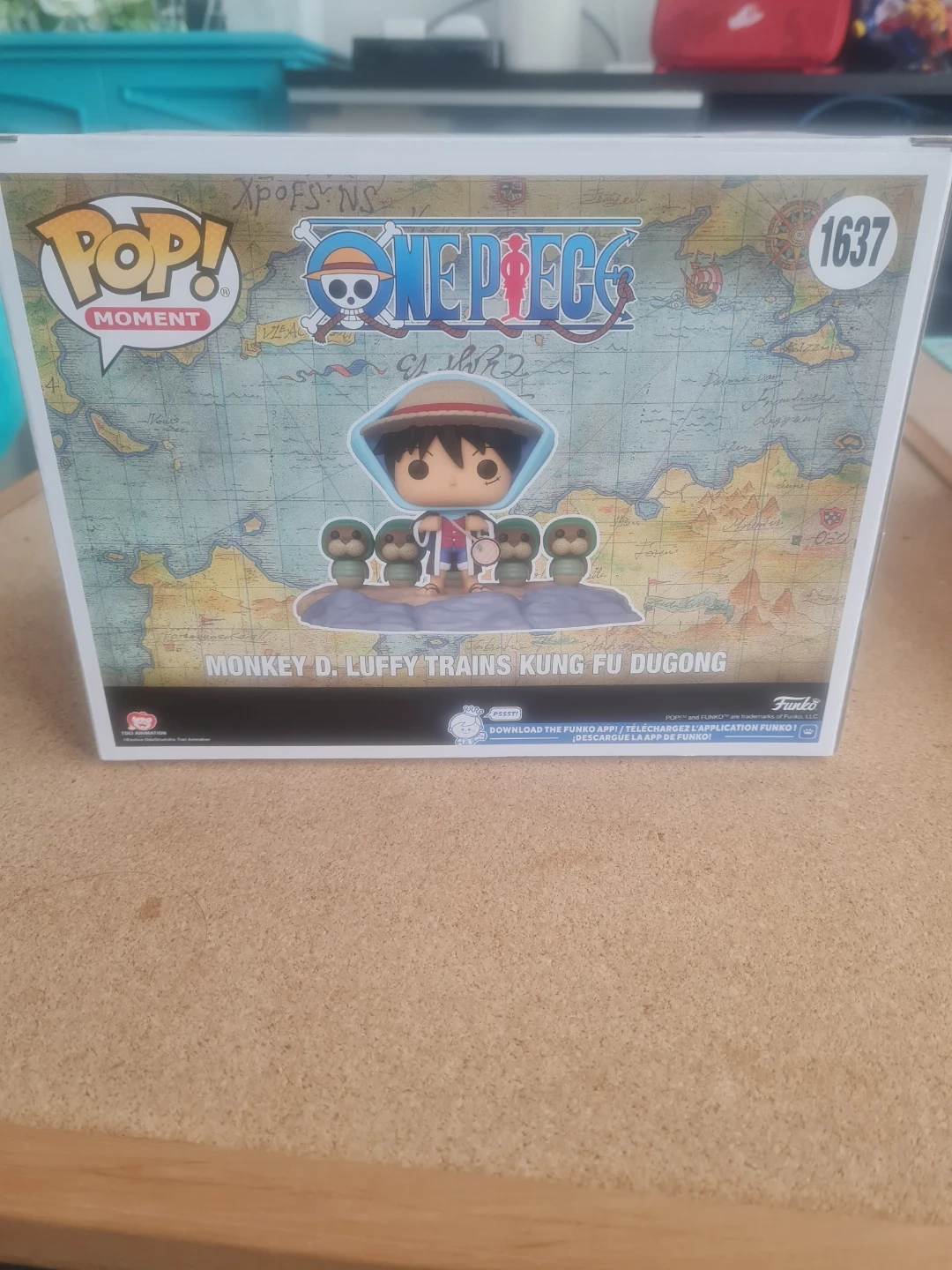 This is a Funko Pop! Moment vinyl figure featuring Monkey D. Luffy training Kung Fu Dugong. The figure is model number 1637. It's part of the One Piece collection. This item comes in its original packaging.