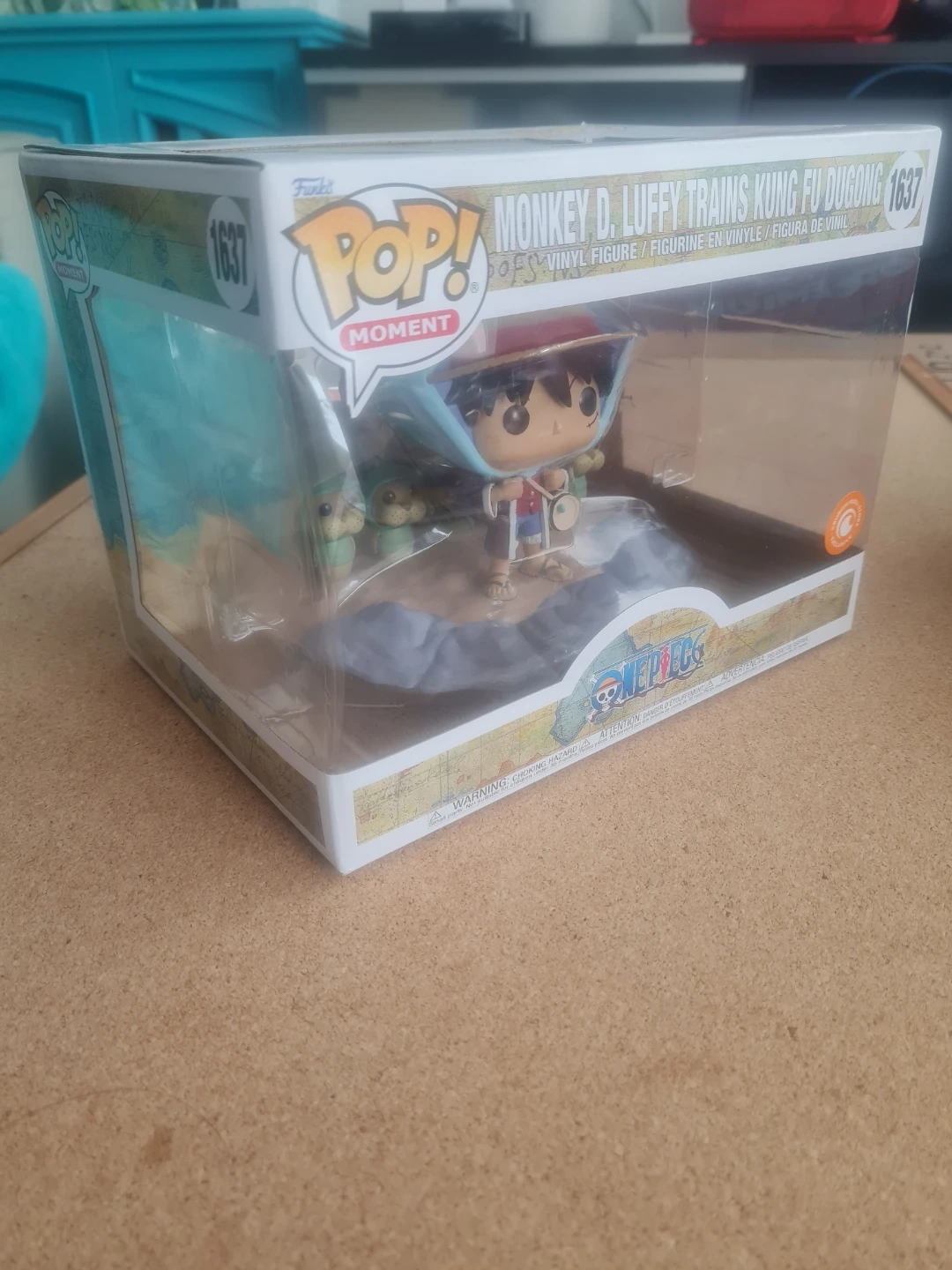 This is a Funko Pop! Moment vinyl figure featuring Monkey D. Luffy training Kung Fu Dugong. The figure is model number 1637. It's part of the One Piece collection. This item comes in its original packaging.