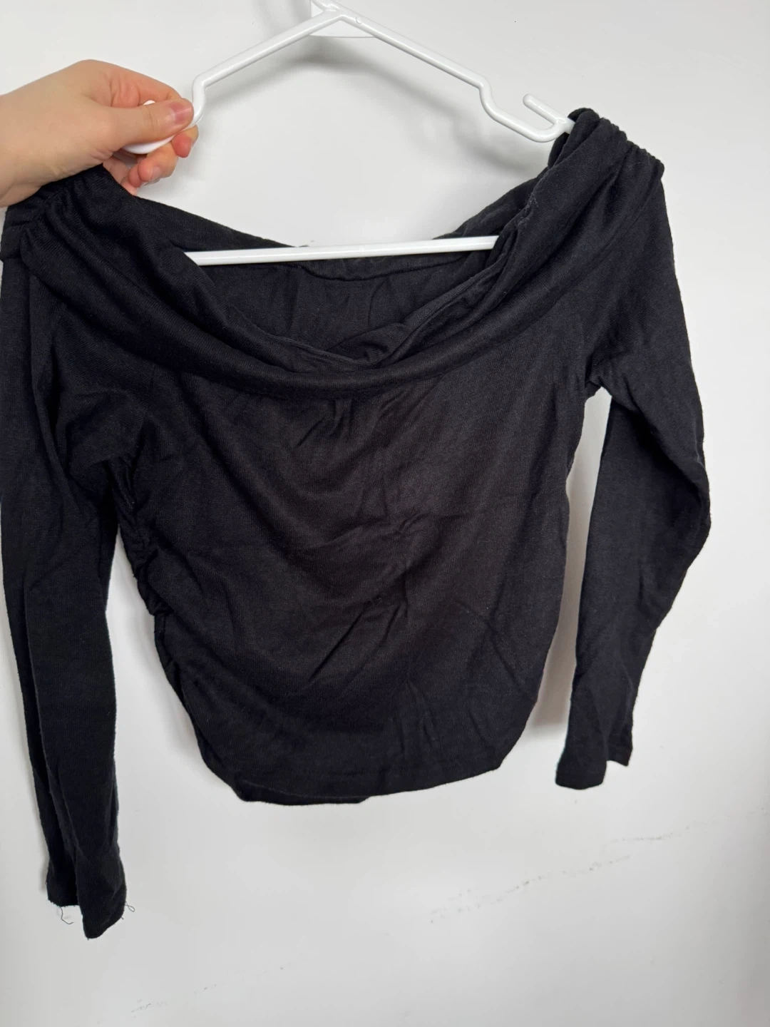 Comfortable black long sleeve top with an off-the-shoulder cowl neck design. It features ruched detailing on the sides. Fabric appears to be a soft knit material.