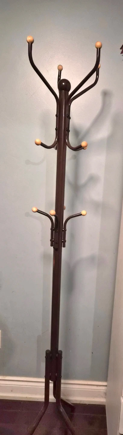 This dark brown coat rack features multiple arms with light wood ball hooks. It has a sturdy metal base and stem. This coat rack is great for keeping your entryway or bedroom tidy!