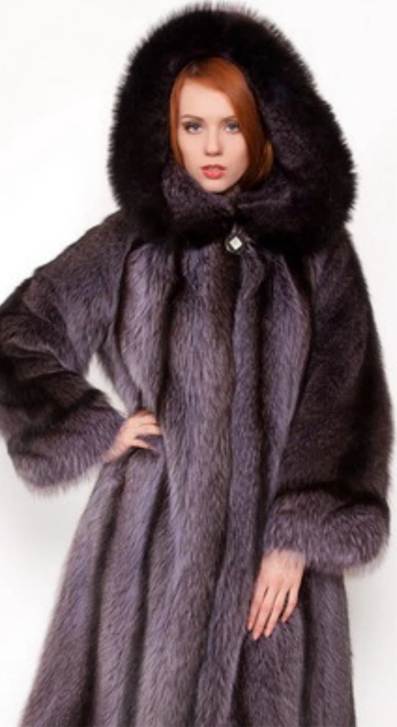 This is full-length polar fox fur coat features a stylish hood and exquisite detailing, making it a standout piece.