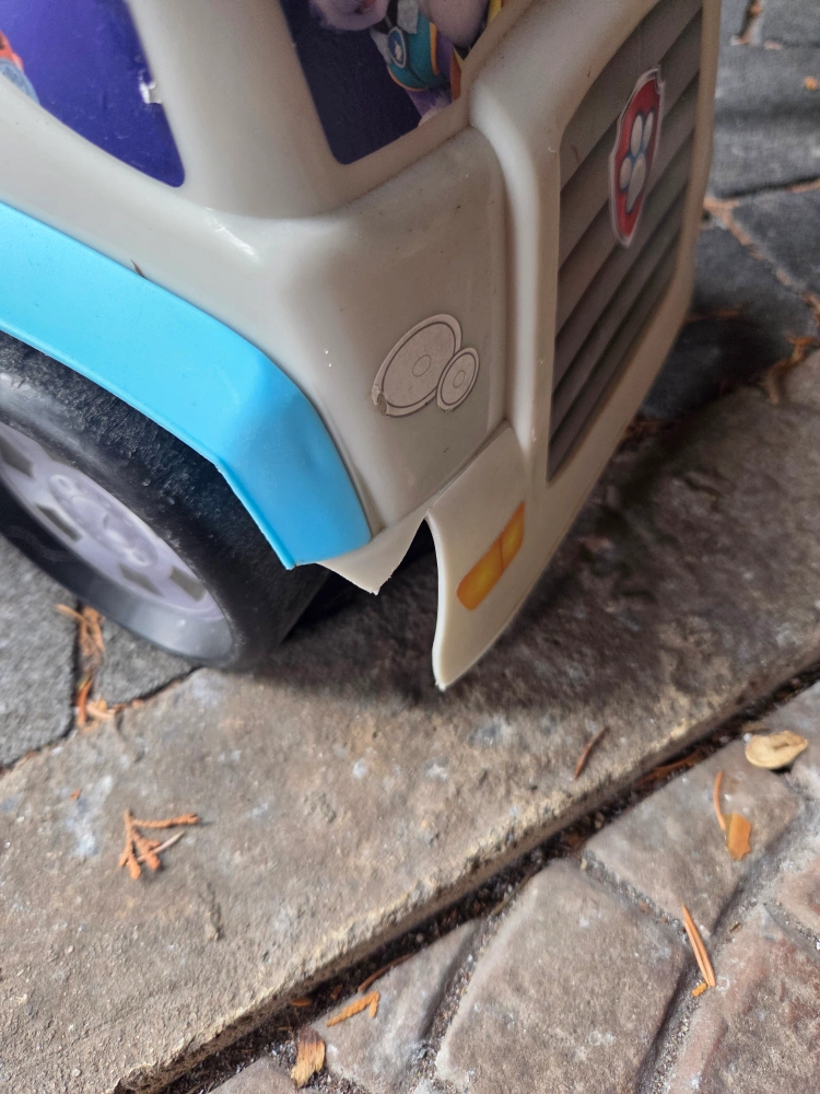 This Paw Patrol ride-on truck features graphics of the popular characters. It has a steering wheel and a seat for a child to sit on. Some minor damage to the front bumper.