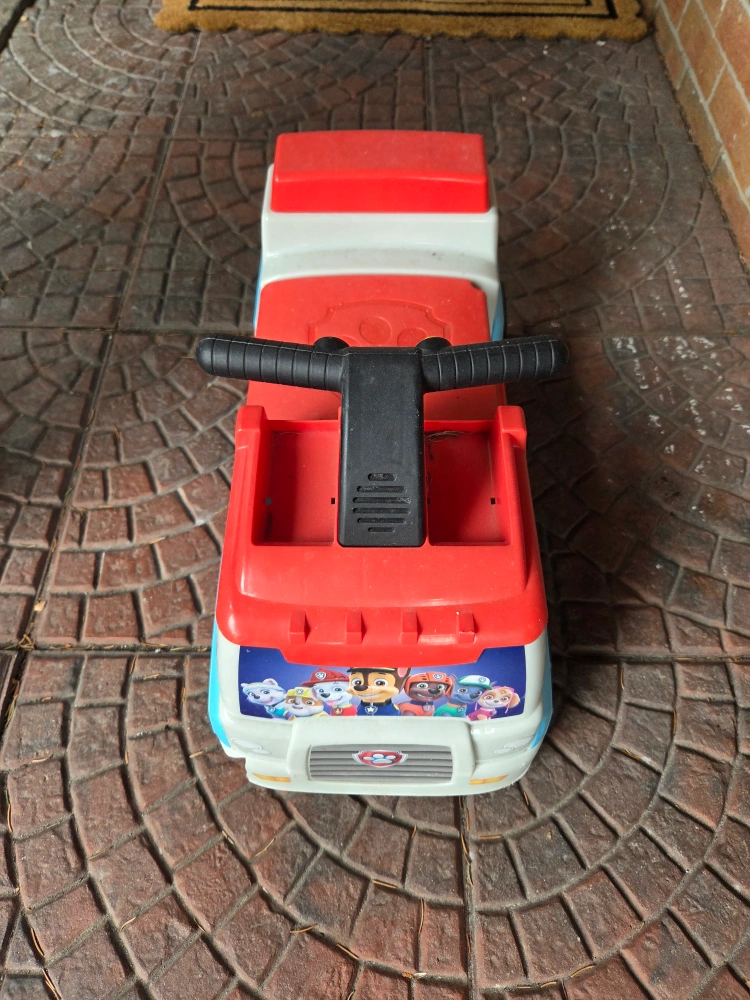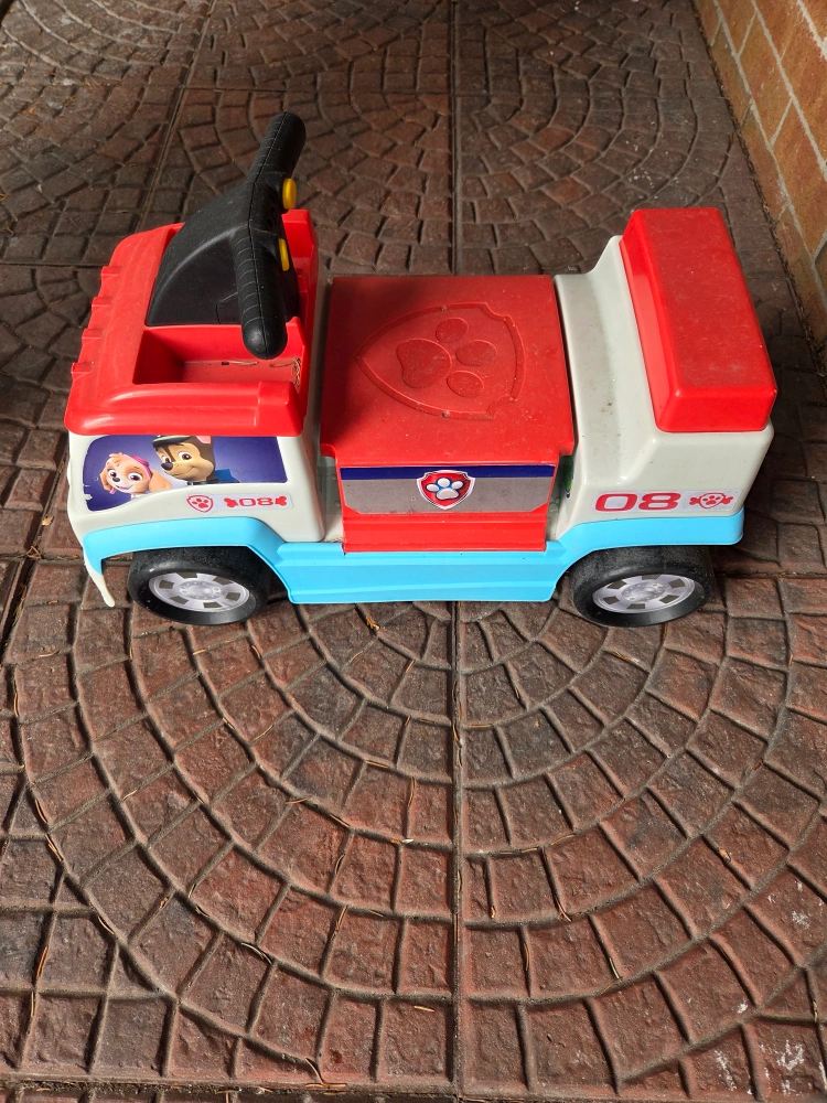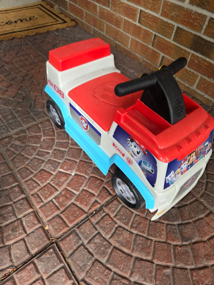 This Paw Patrol ride-on truck features graphics of the popular characters. It has a steering wheel and a seat for a child to sit on. Some minor damage to the front bumper.