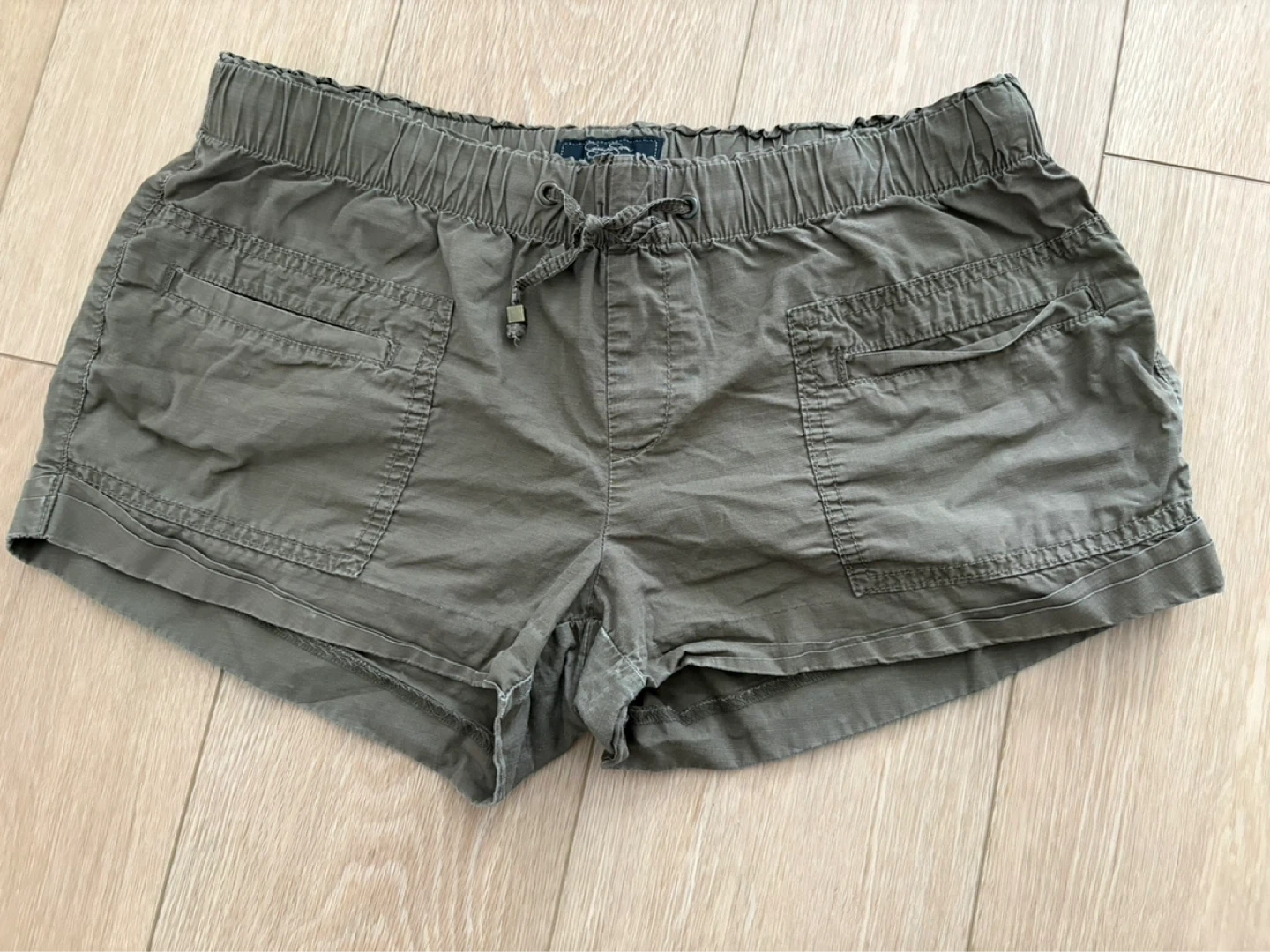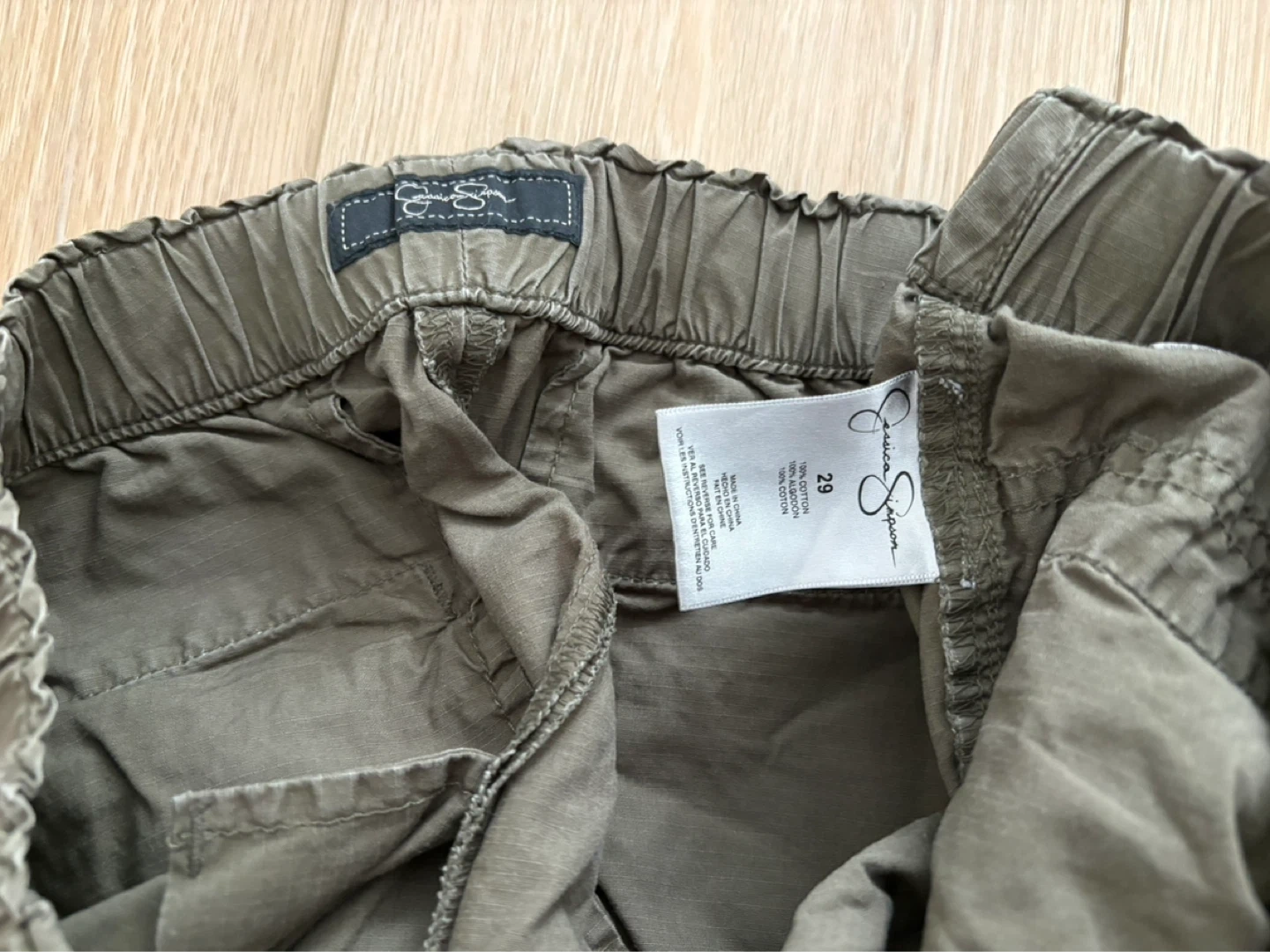 These khaki cargo shorts from Jessica Simpson are a size 29. They're made from 100% cotton with an elastic waistband and drawstring. Multiple pockets are included for convenience. Super stylish!