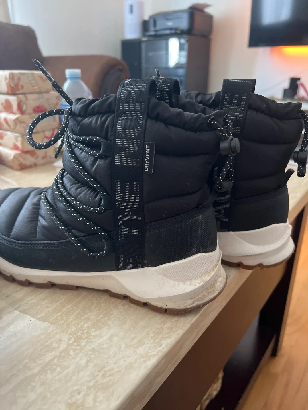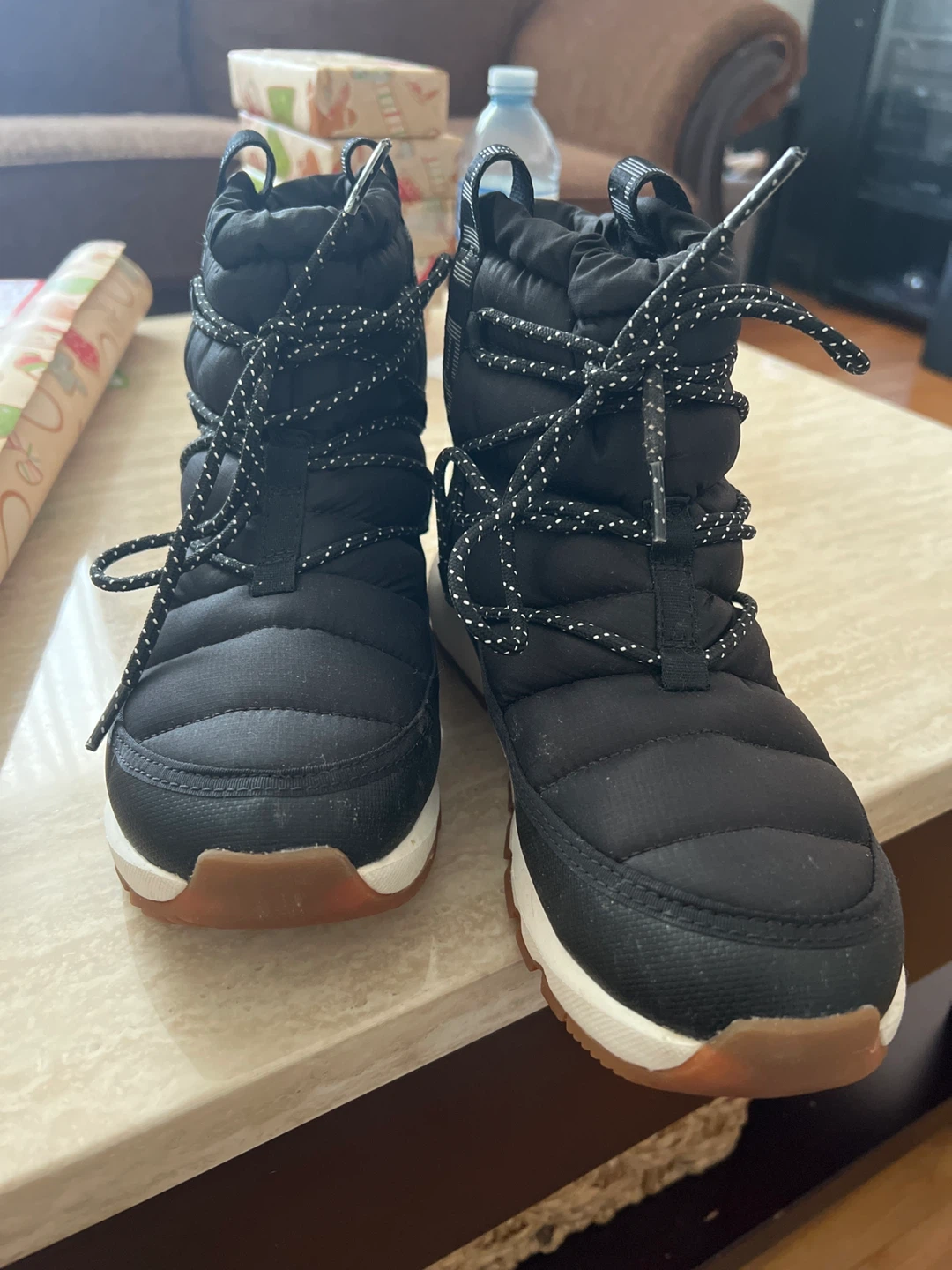 These black puffer booties from The North Face are in great shape! They are perfect for keeping your feet warm and dry during the colder months. They feature a durable outsole and a comfortable, insulated lining. These boots are sure to keep you cozy and stylish all winter long!