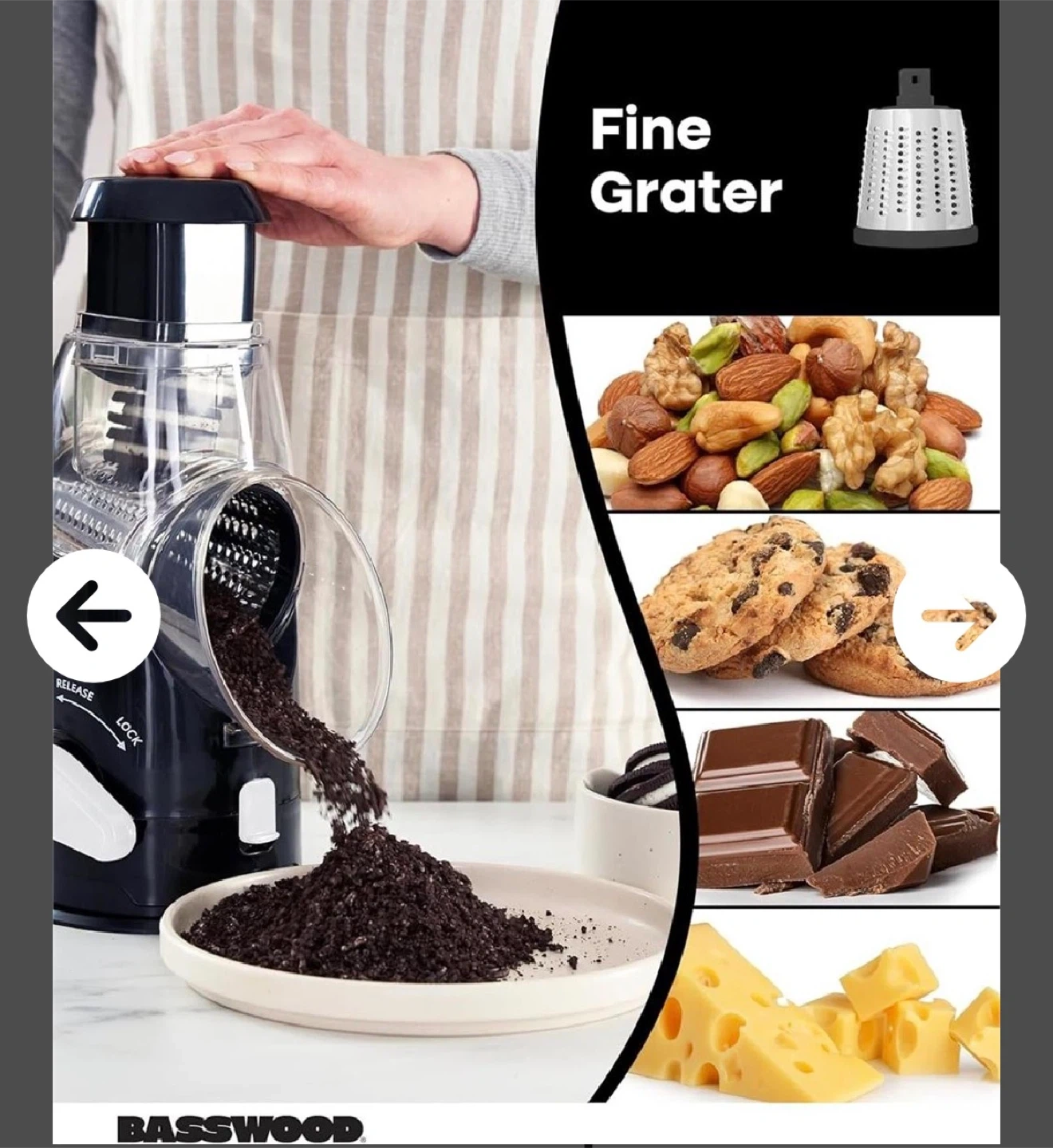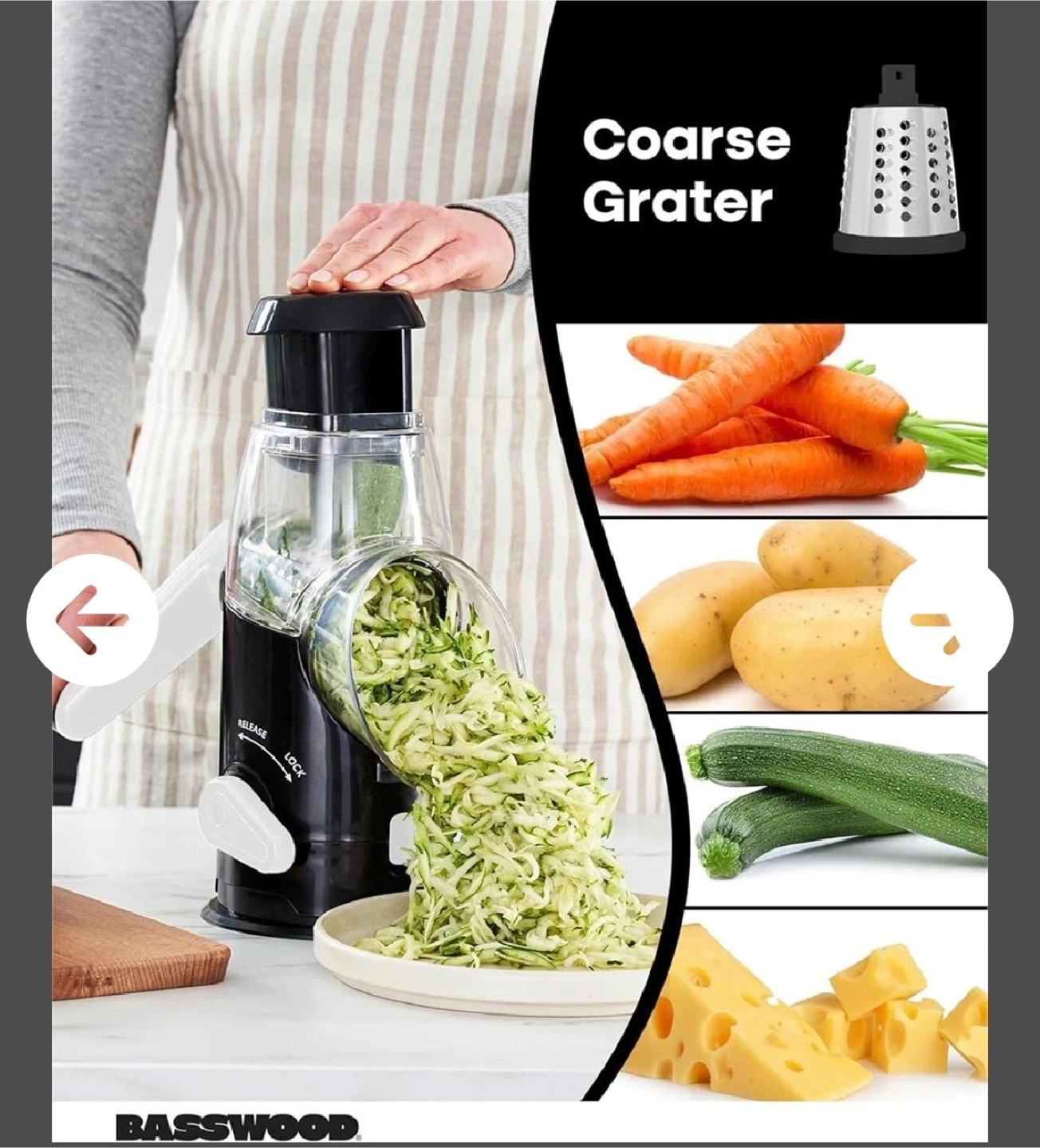 This Basswood rotary grater comes with fine and coarse grating drums. It's designed for quickly shredding cheese, nuts, chocolate, and vegetables. A great kitchen tool for easy prep!