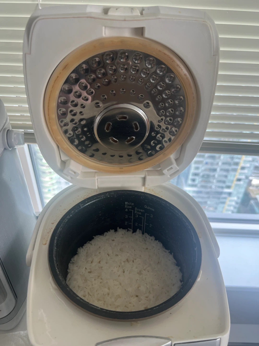 This Panasonic rice cooker uses microcomputer technology to cook your rice perfectly every time. It has various settings for white rice, brown rice, quick cook, and slow cook. The inner pot is marked for different rice types and quantities.