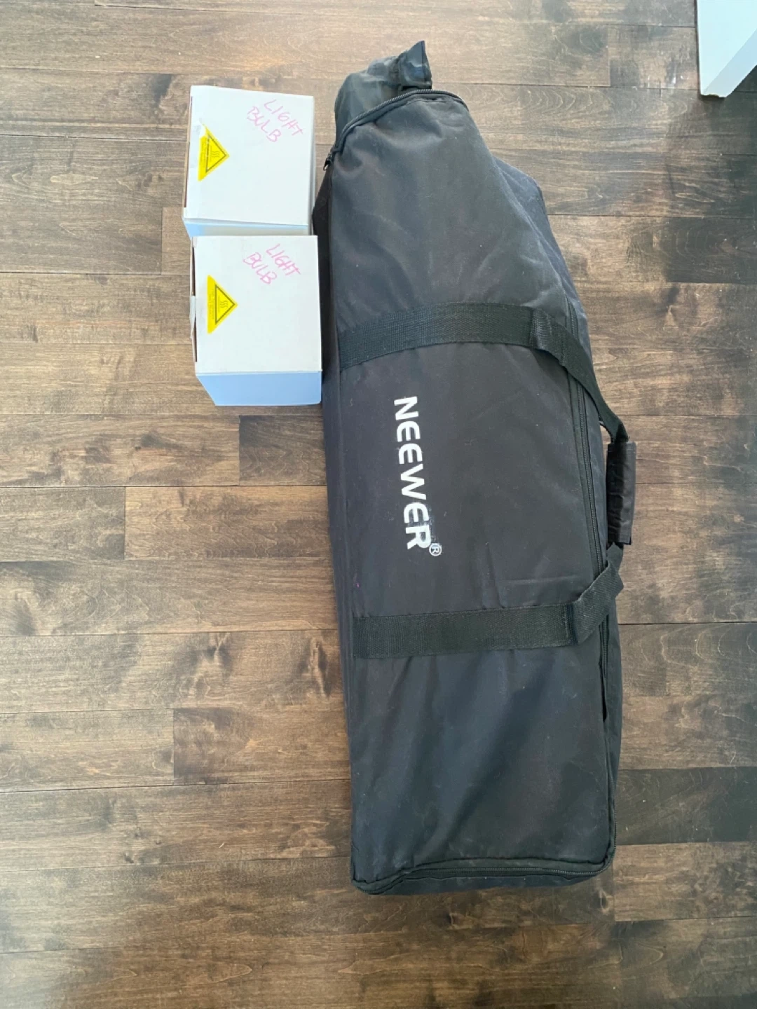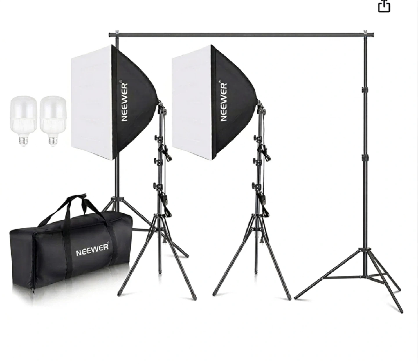 This Neewer softbox lighting kit includes 2 Umbrella Softbox with two light bulbs 5500k and a background stand.