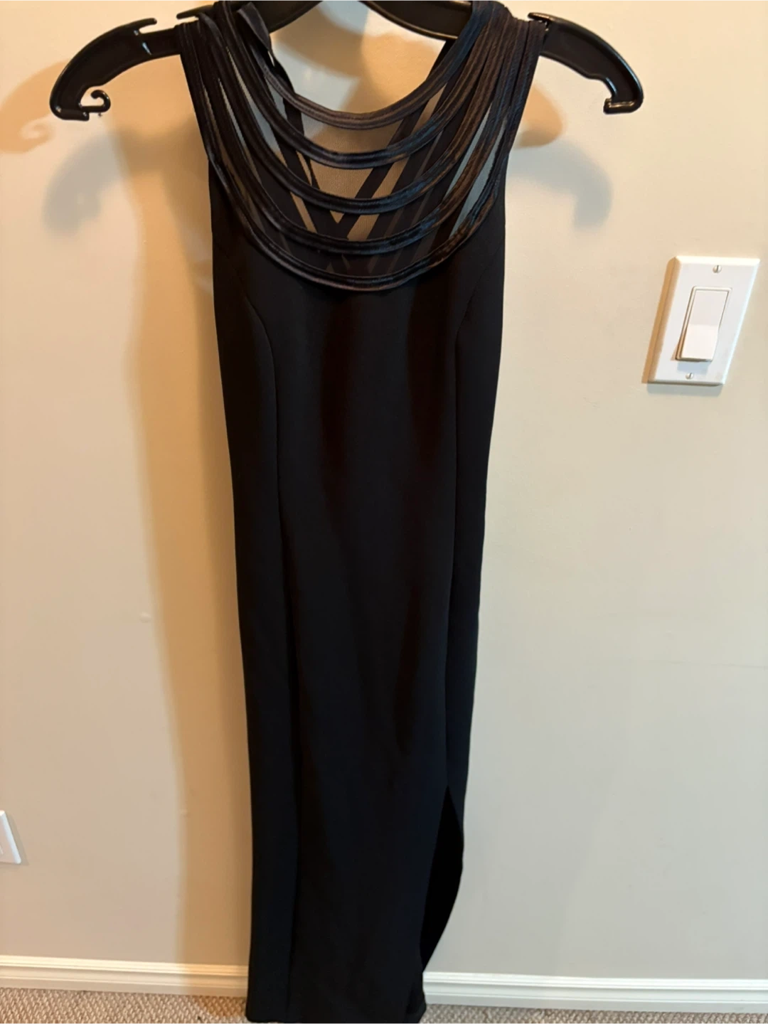 Selling a beautiful black dress from Mark Edwards in size 6. It features a unique strap design on the back and a sleek, elegant look. Perfect for a night out or a special occasion!