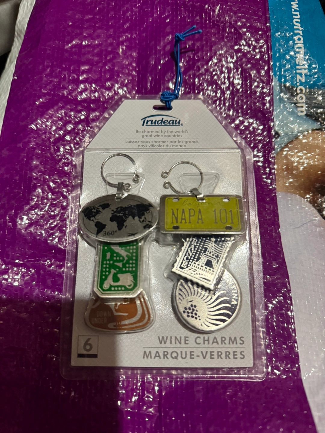 Six metal wine charms. Includes designs representing various wine regions. New in package.
