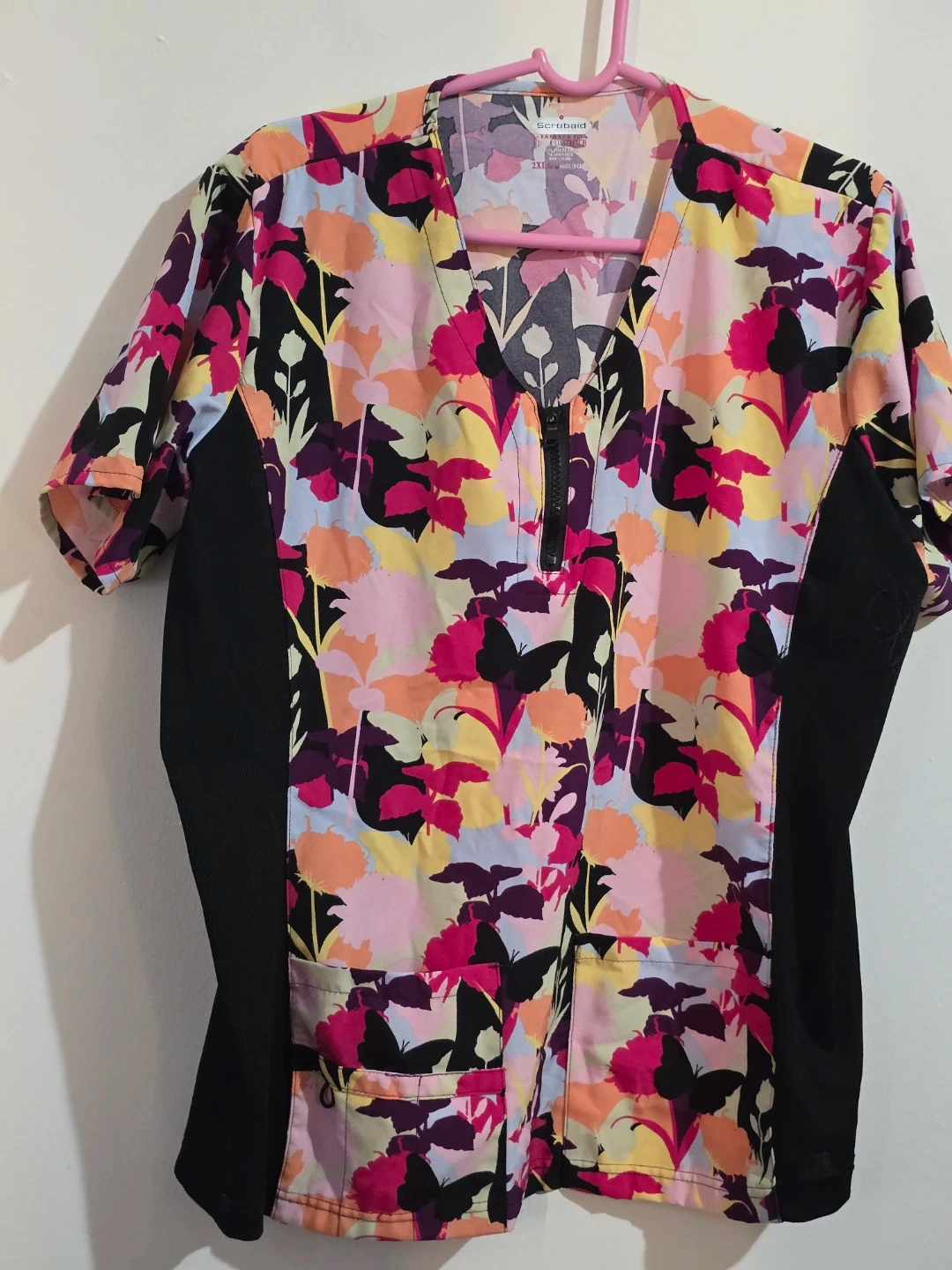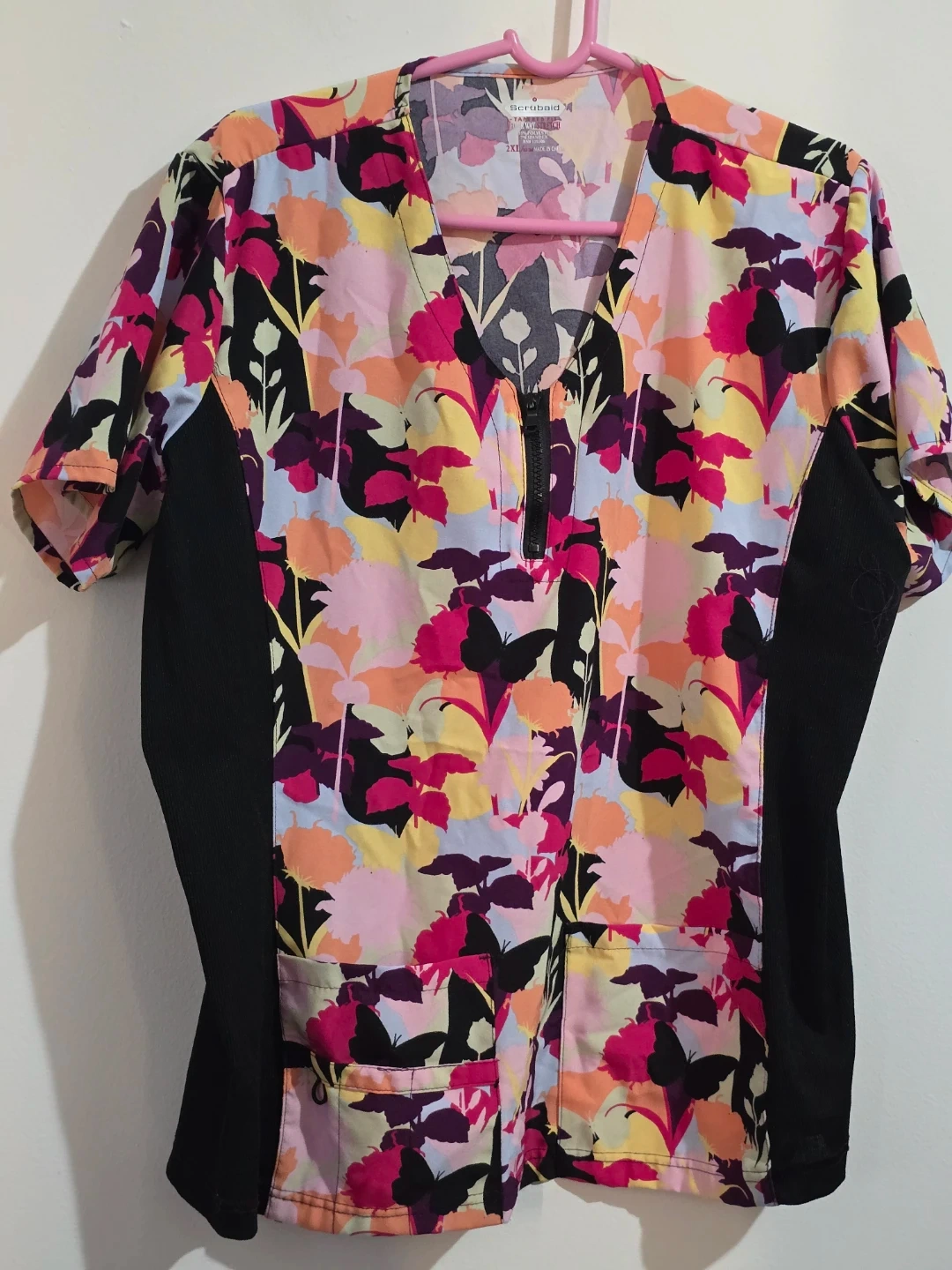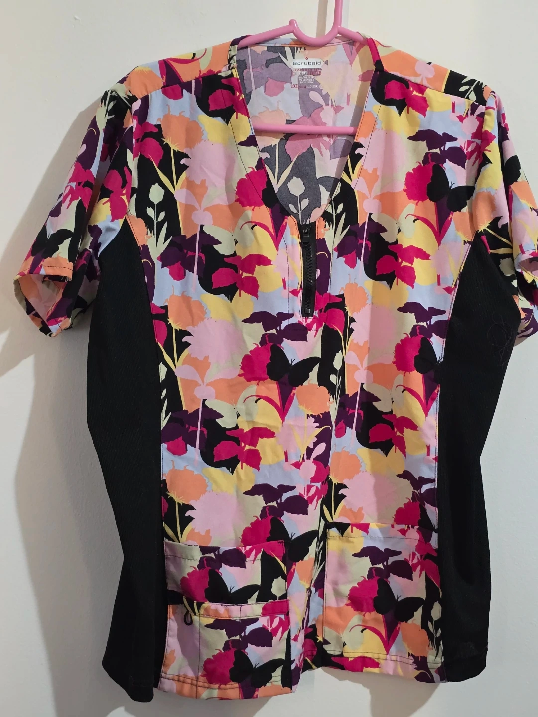 This Scrubaid scrub top features a vibrant floral print with black side panels. It's made with a four-way stretch fabric for comfort. 93% polyester, 7% spandex. Made in China. Size 2XL.