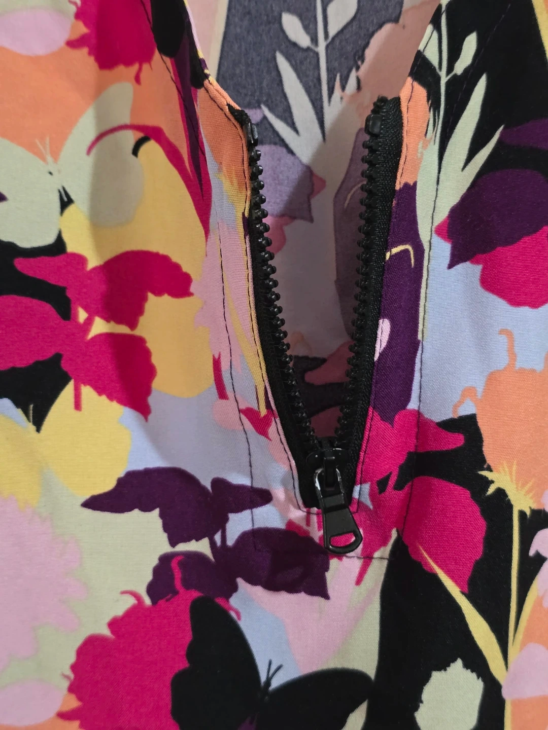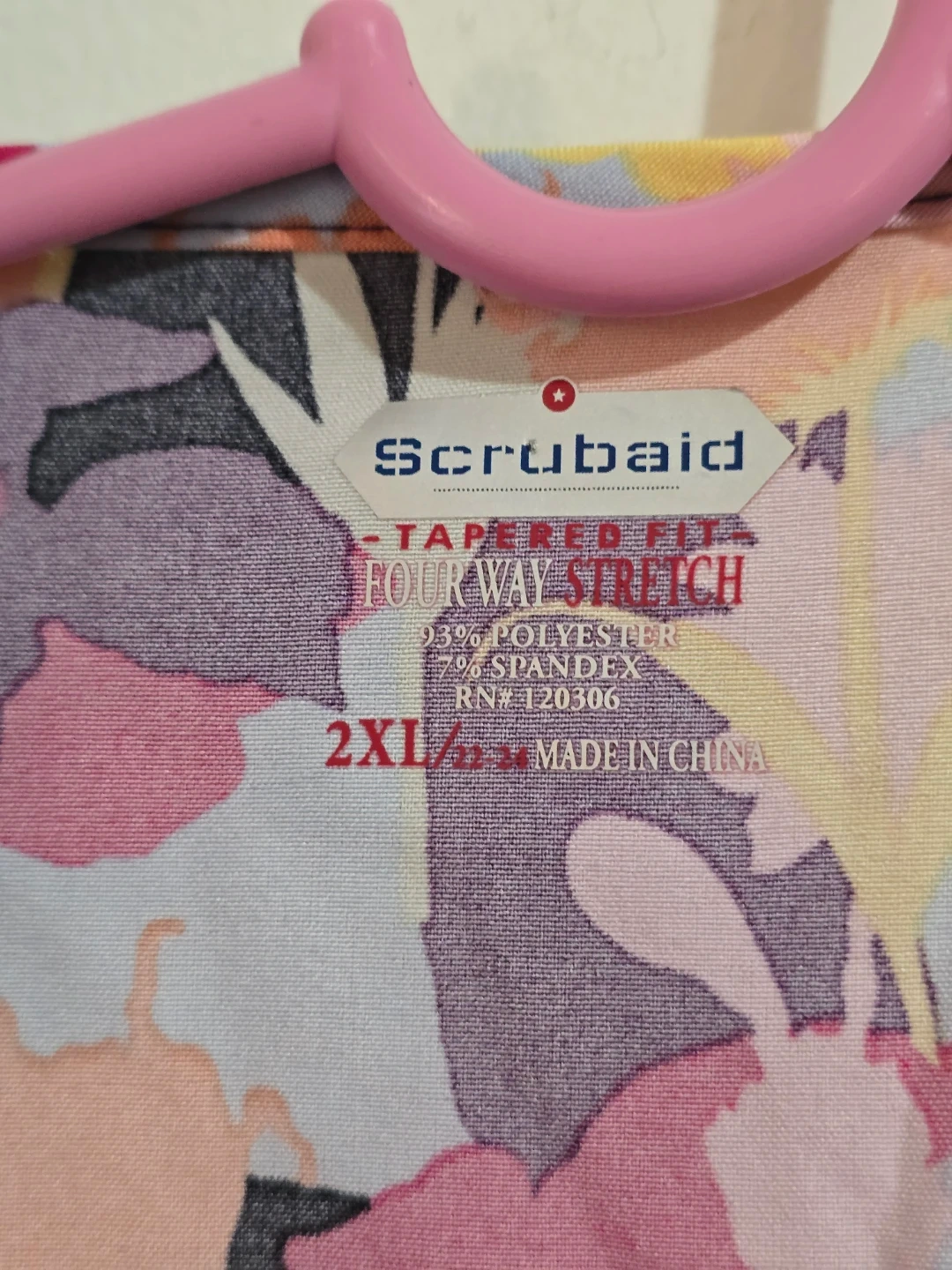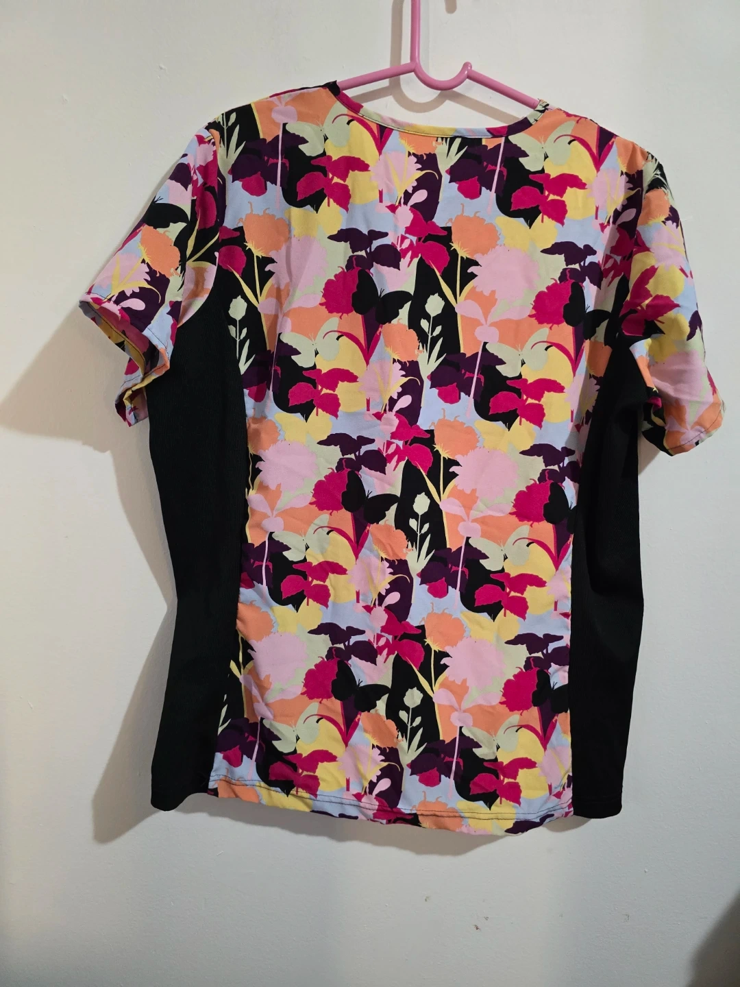 This Scrubaid scrub top features a vibrant floral print with black side panels. It's made with a four-way stretch fabric for comfort. 93% polyester, 7% spandex. Made in China. Size 2XL.