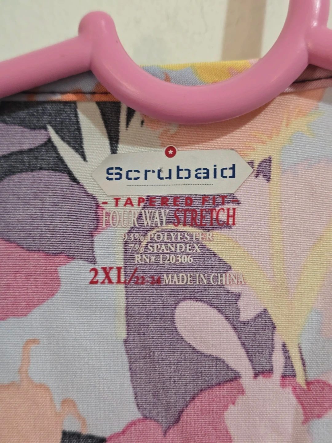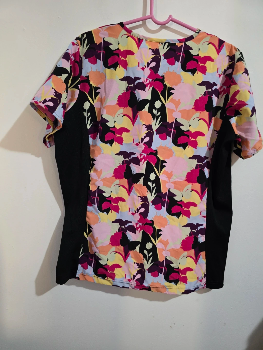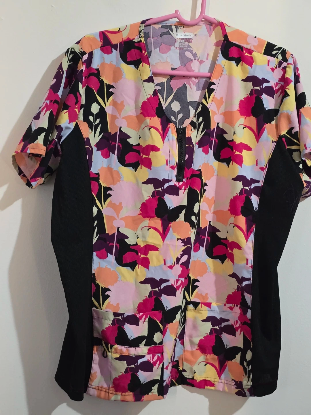 This Scrubaid scrub top features a vibrant floral print with black side panels. It's made with a four-way stretch fabric for comfort. 93% polyester, 7% spandex. Made in China. Size 2XL.