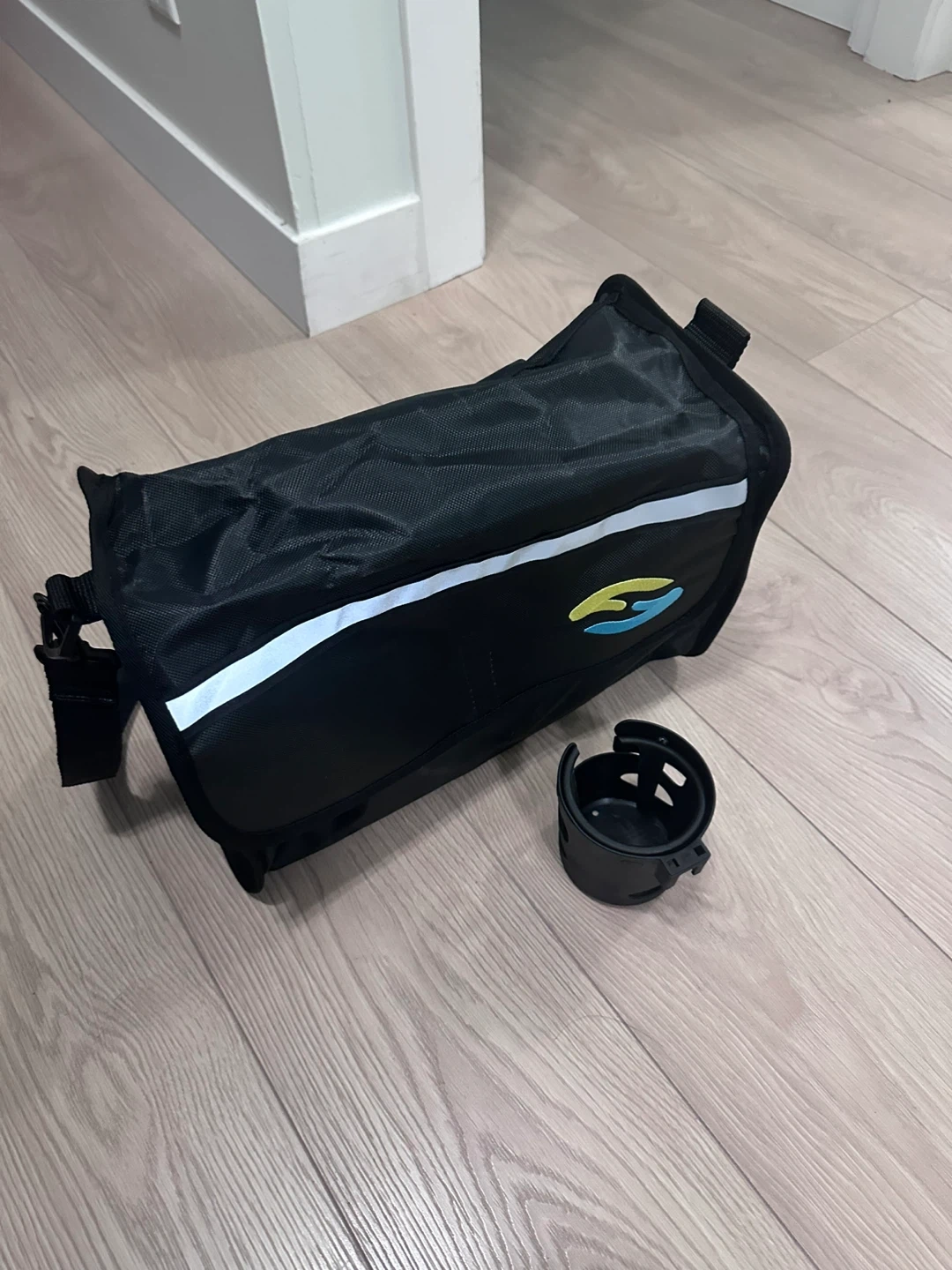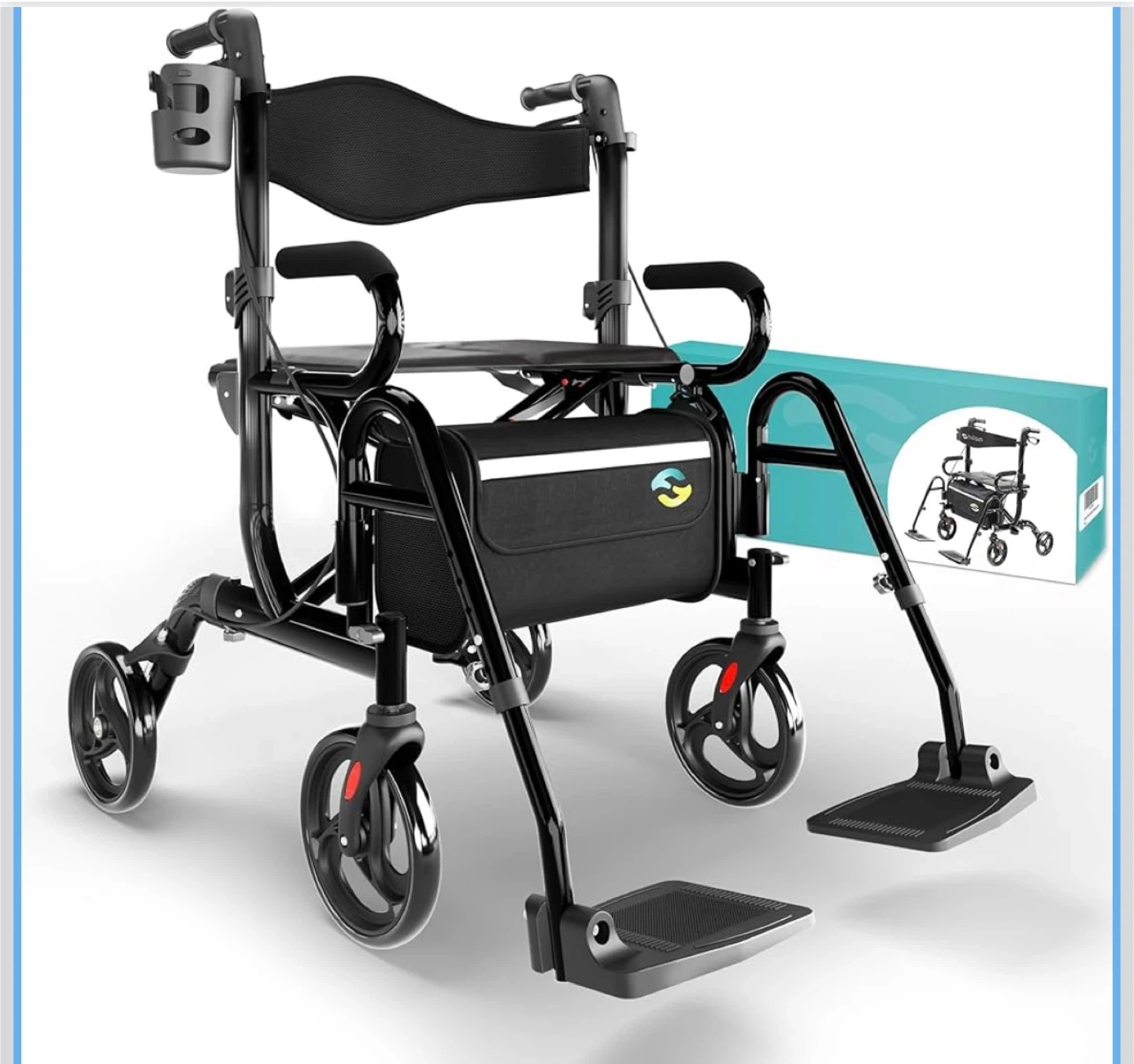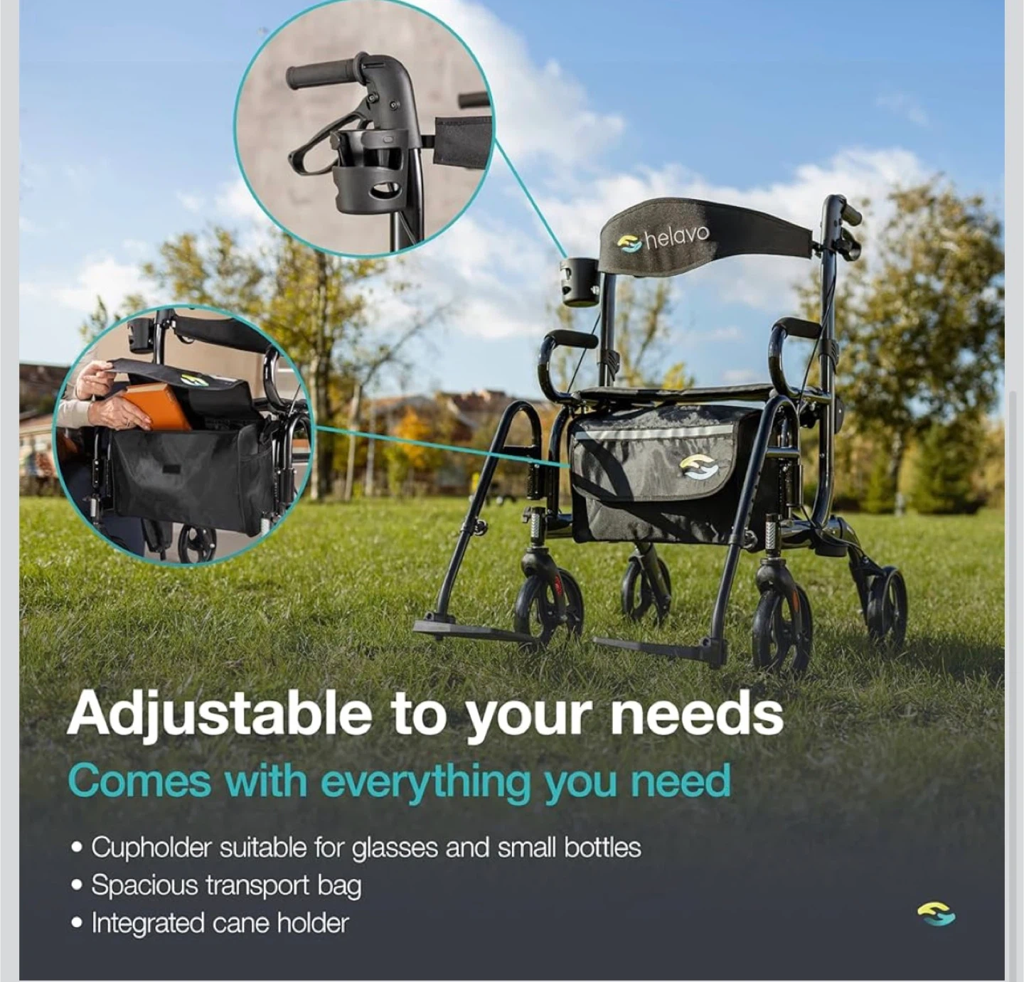 This is a black Helavo medical walker/wheelchair with a seat and footrests. It comes with a storage bag and a cup holder. It's foldable for easy transport. Useful for mobility assistance and travel.