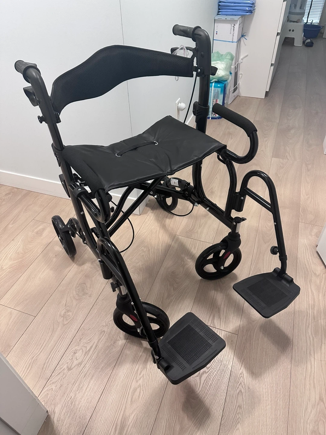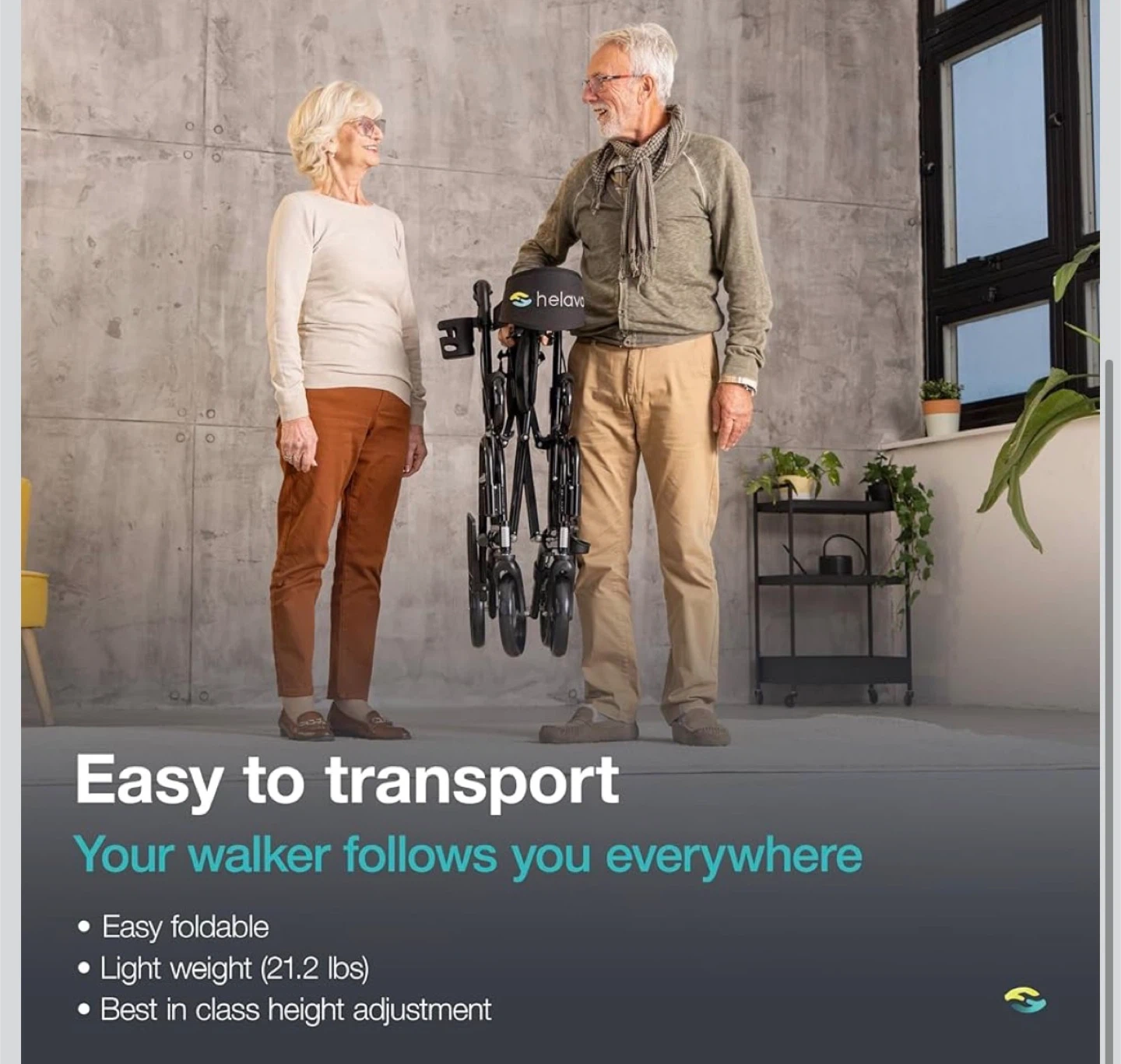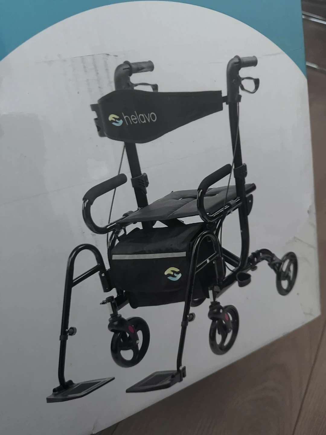 This is a black Helavo medical walker/wheelchair with a seat and footrests. It comes with a storage bag and a cup holder. It's foldable for easy transport. Useful for mobility assistance and travel.
