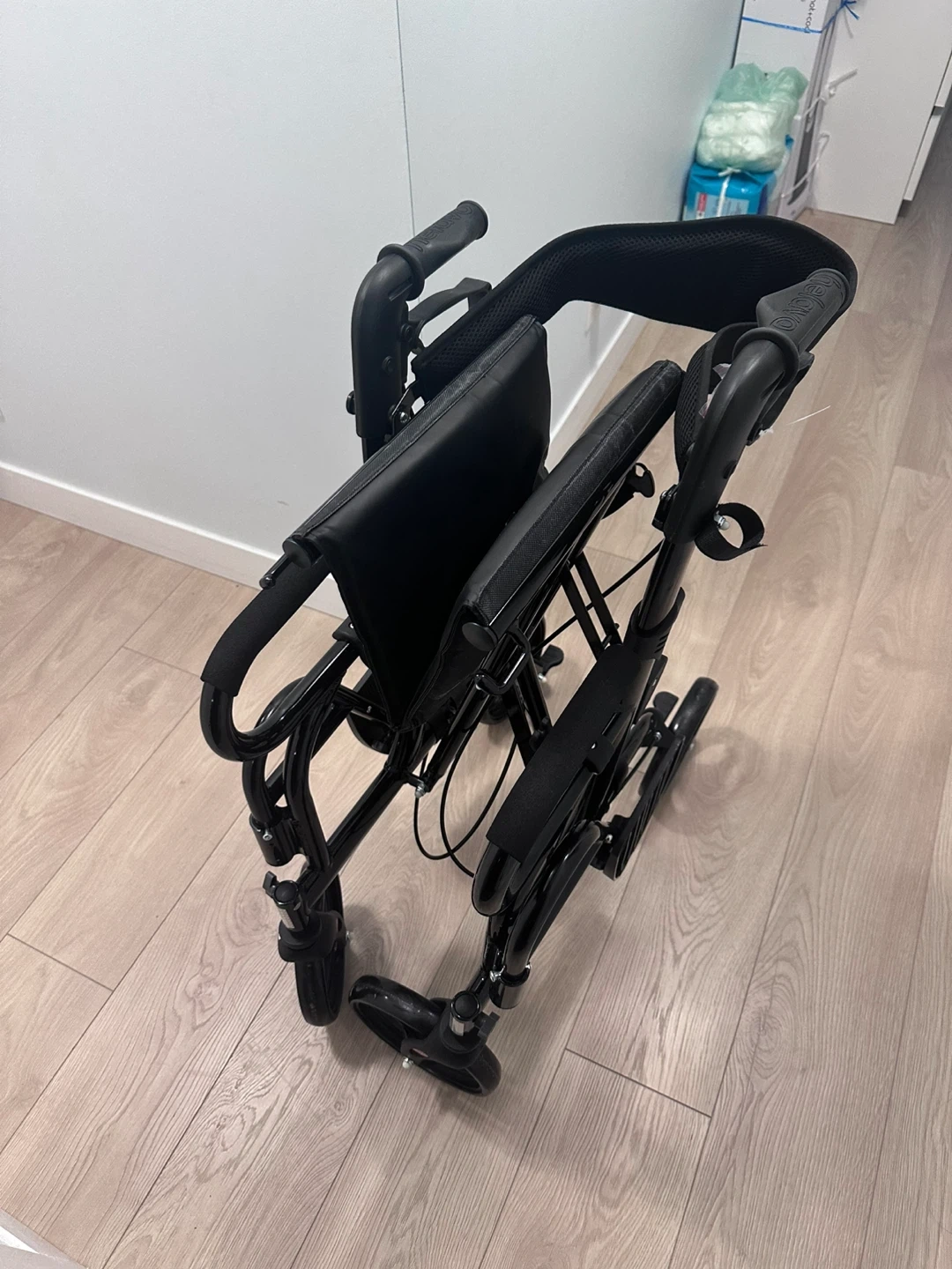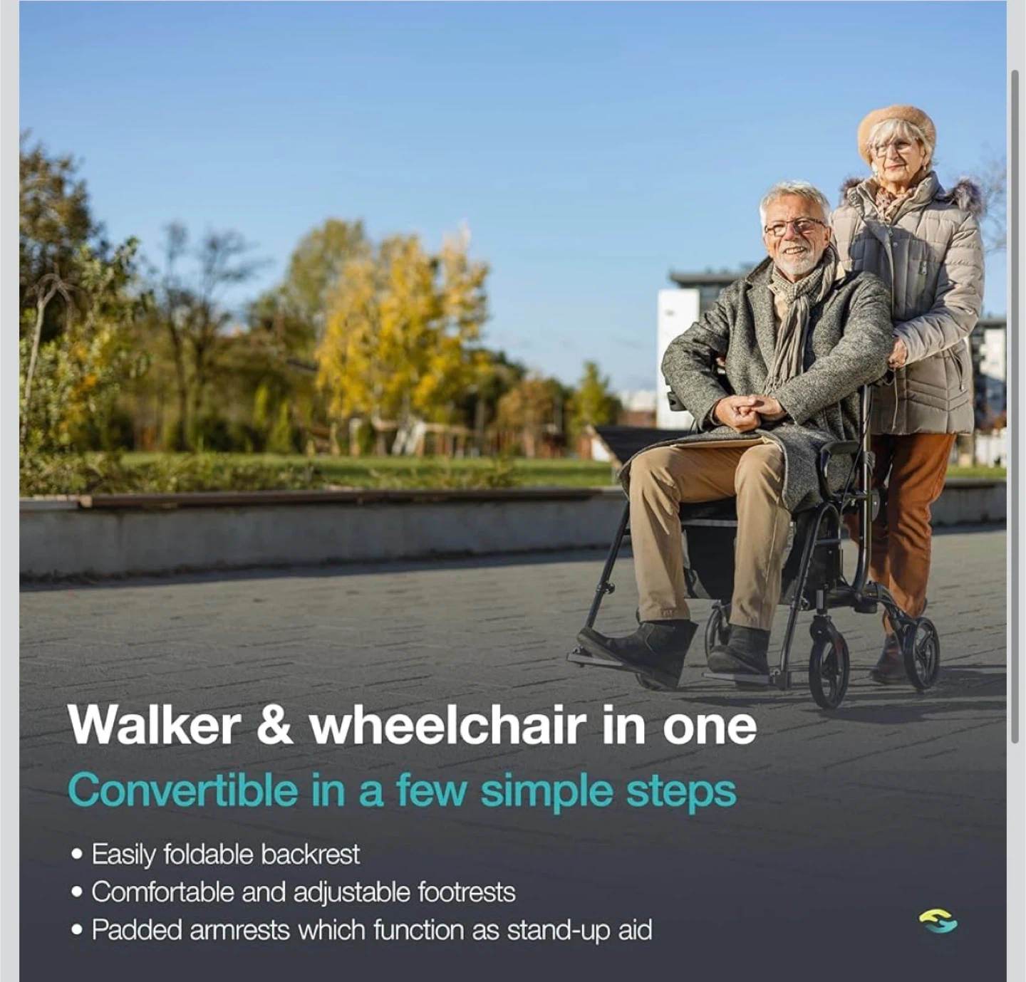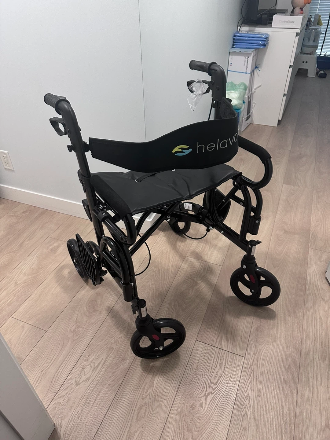 This is a black Helavo medical walker/wheelchair with a seat and footrests. It comes with a storage bag and a cup holder. It's foldable for easy transport. Useful for mobility assistance and travel.
