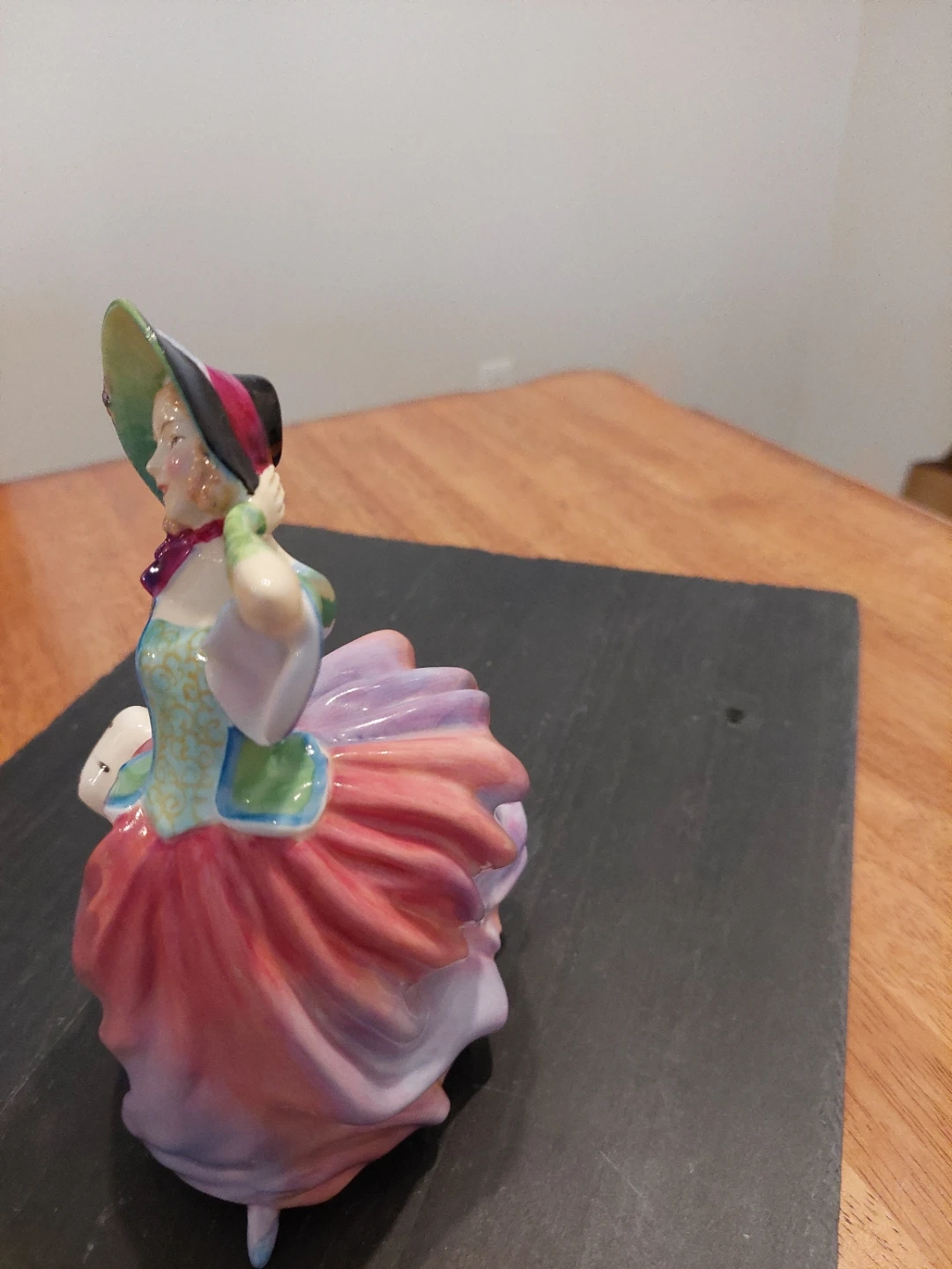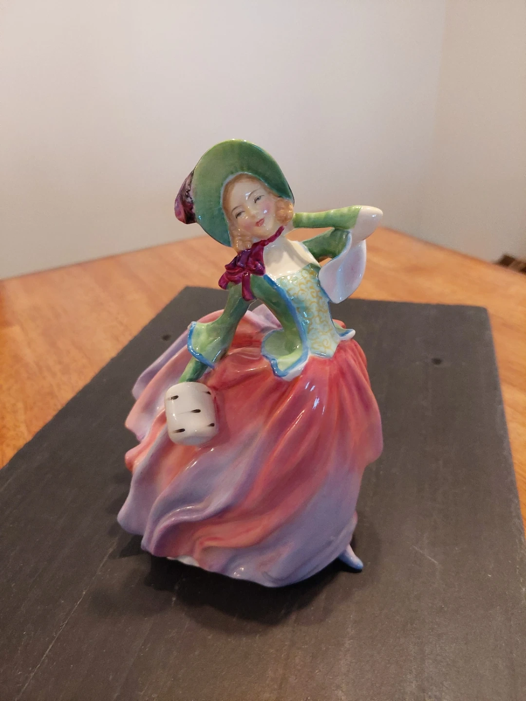 This is a Royal Doulton "Autumn Breezes" figurine, model number HN 1911. It's made of porcelain and is vibrantly coloured. A beautiful decorative piece for any collection!