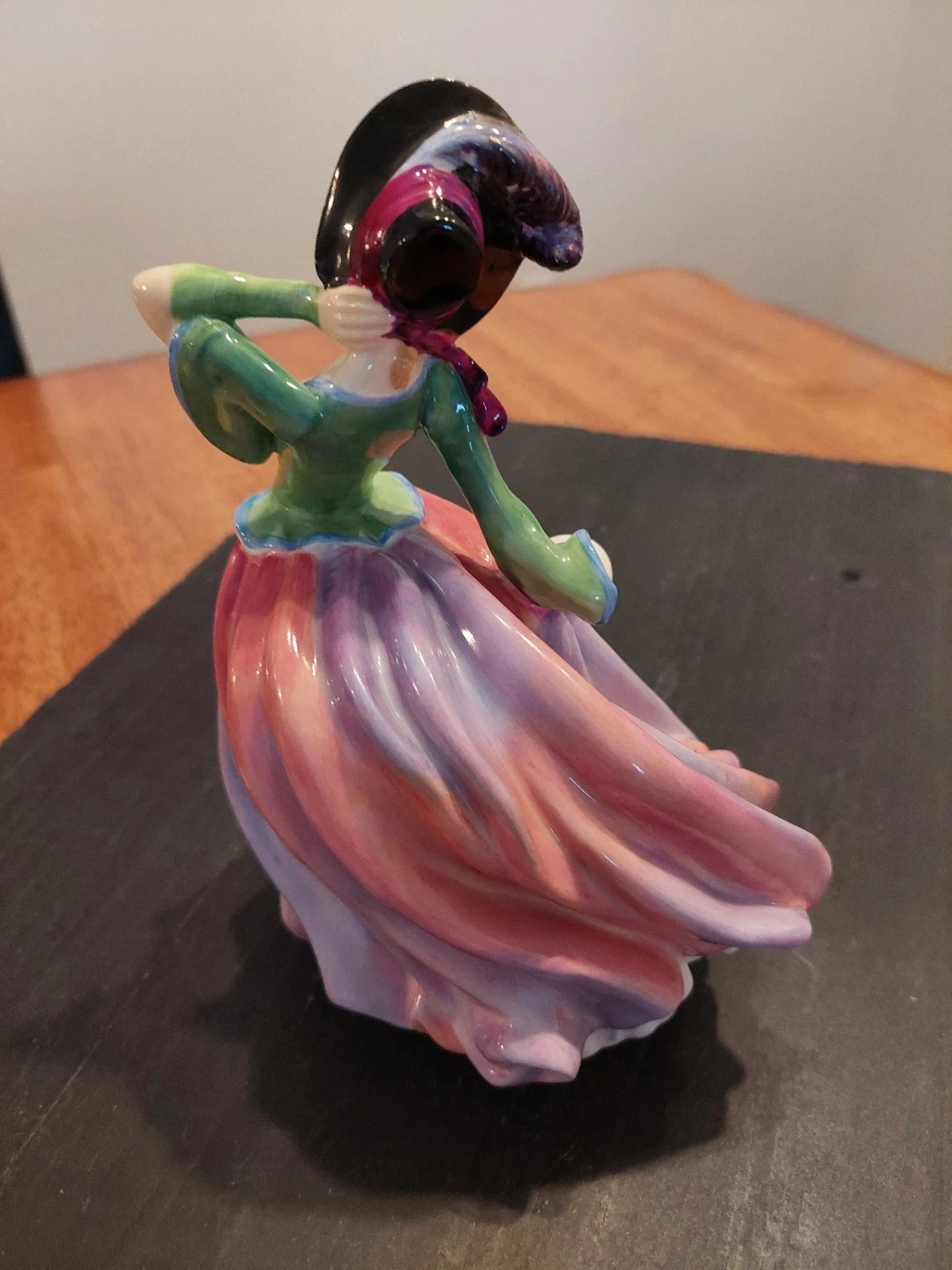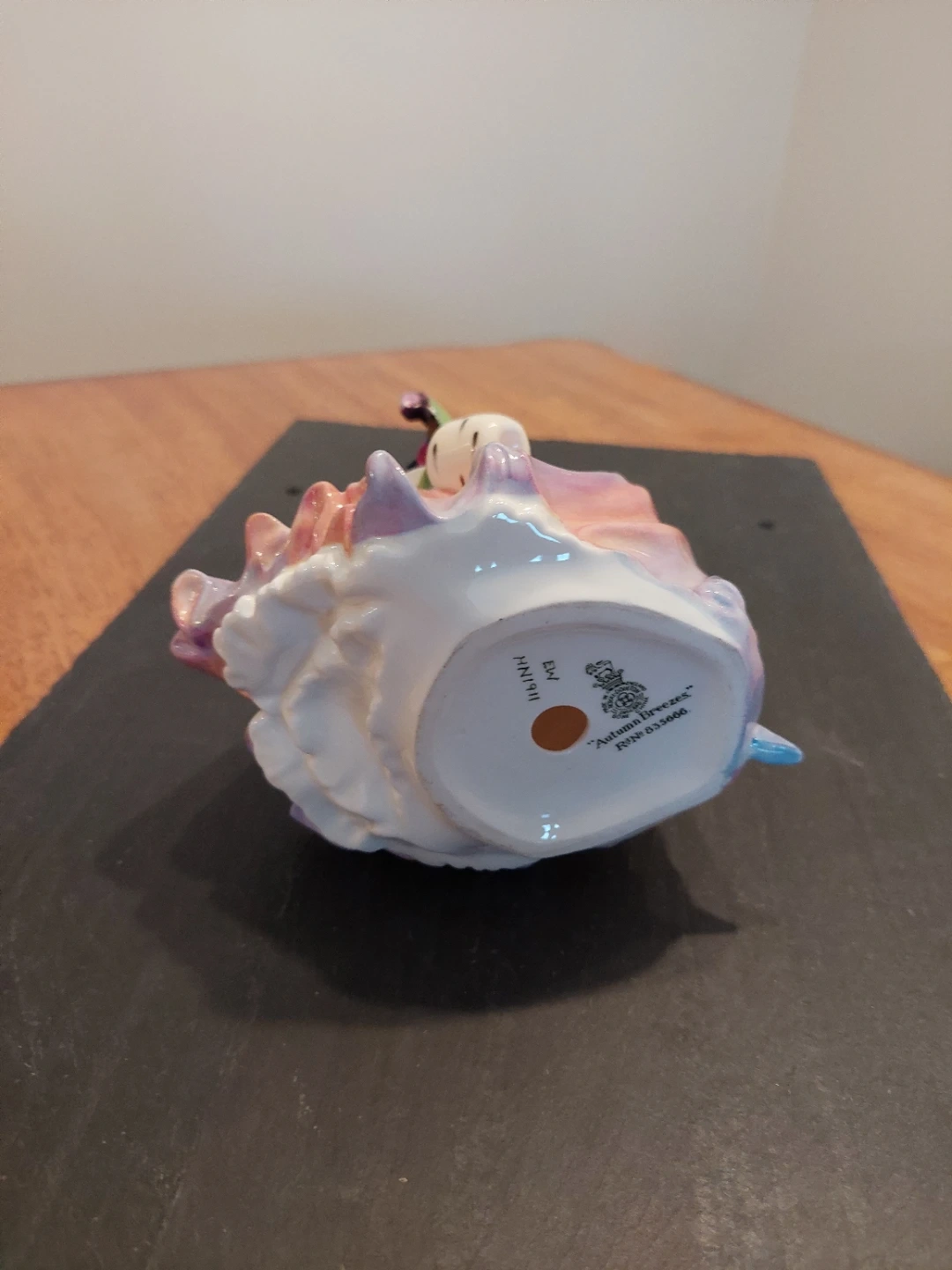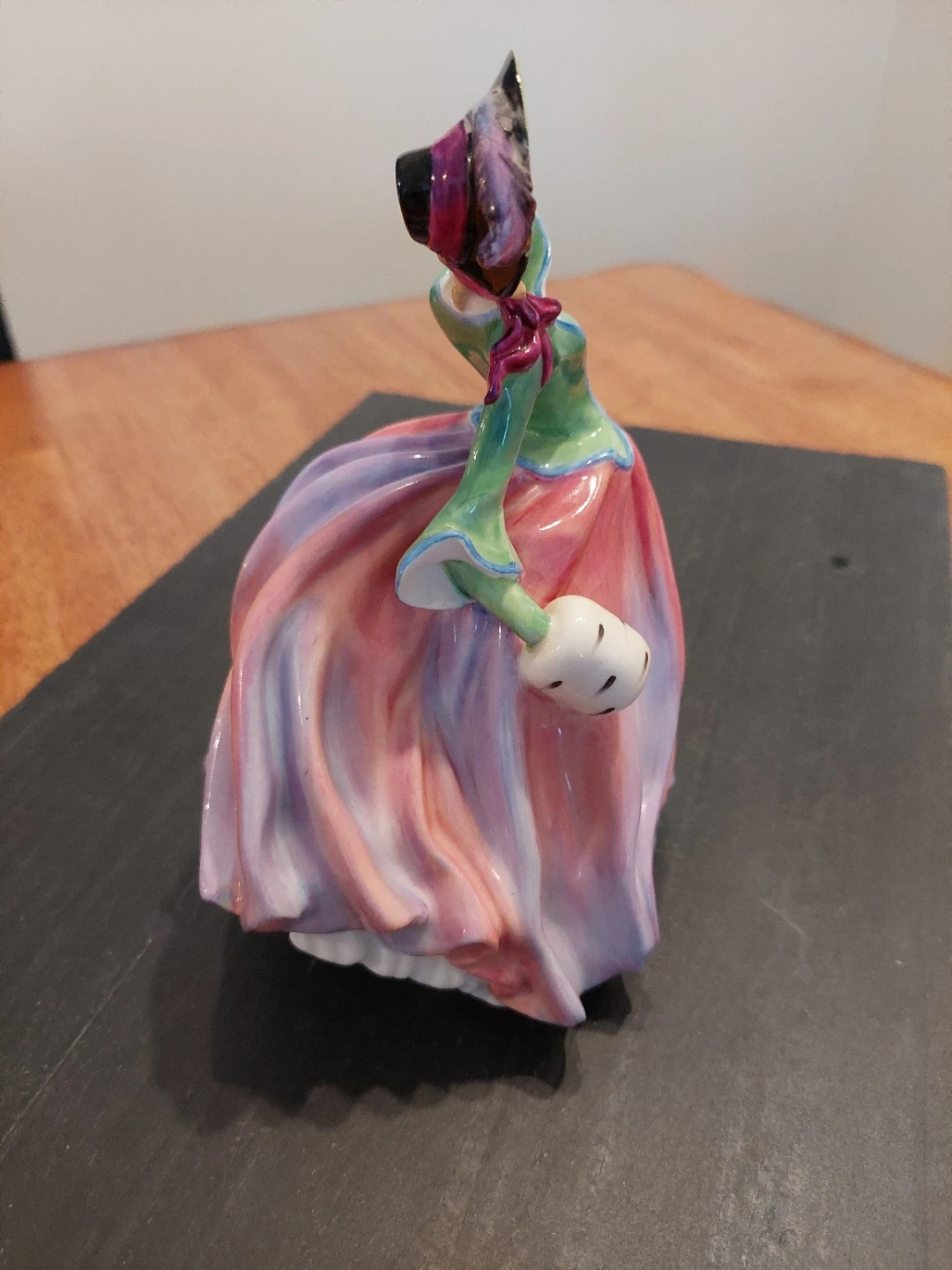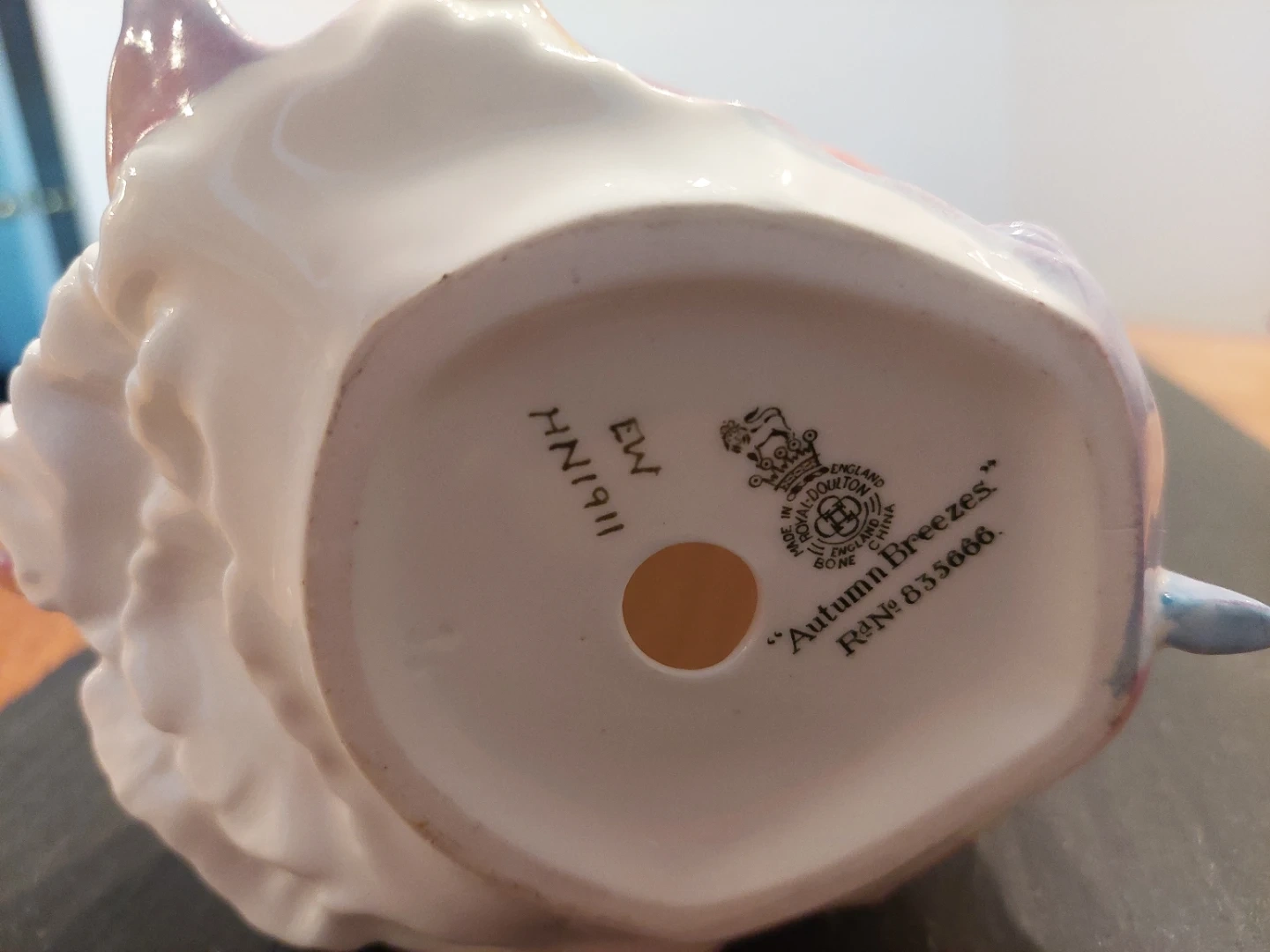 This is a Royal Doulton "Autumn Breezes" figurine, model number HN 1911. It's made of porcelain and is vibrantly coloured. A beautiful decorative piece for any collection!