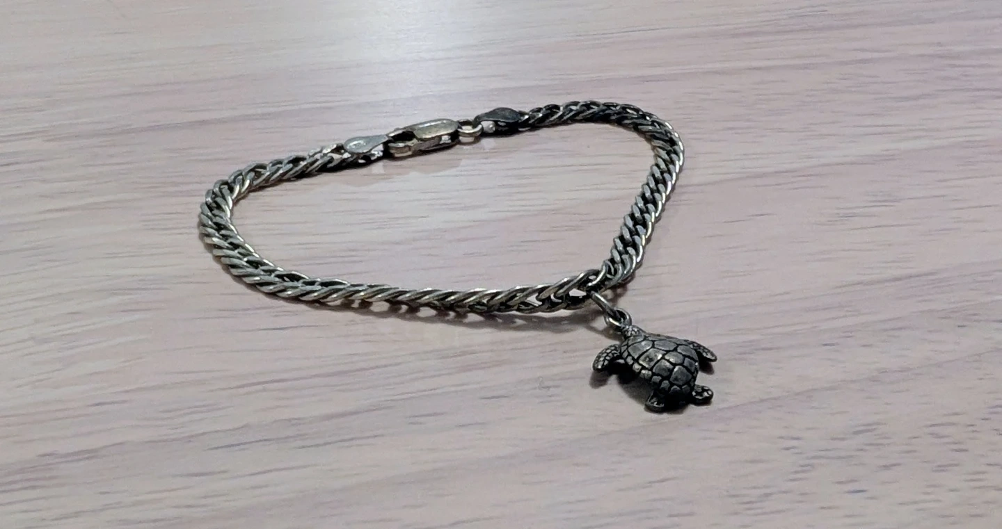 A delicate silver bracelet with a detailed turtle charm. It features a sturdy clasp and a braided chain design. This bracelet adds a unique touch to any outfit.