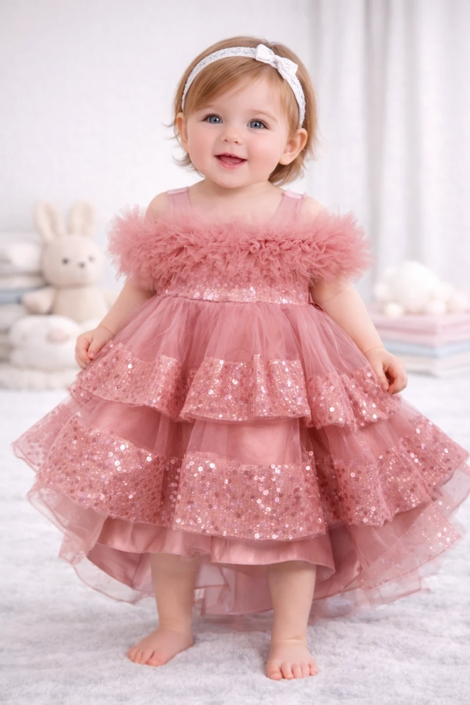 Beautiful pink dress with layered tulle and sequin details. Features a satin sash and a fuzzy neckline. Perfect for special occasions!