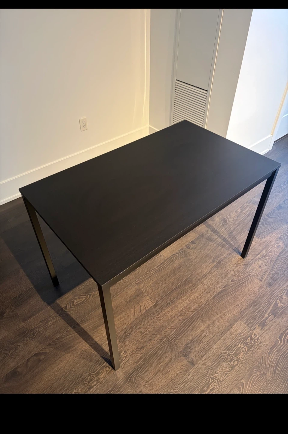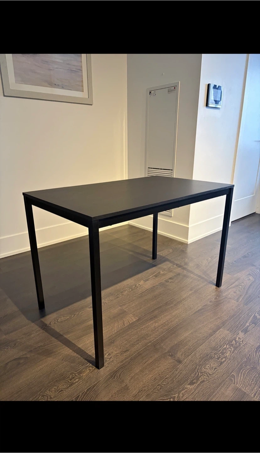 A simple black dining table with a modern design. Its rectangular shape and clean lines make it a versatile piece for any dining area. Perfect for meals or as a workspace.
