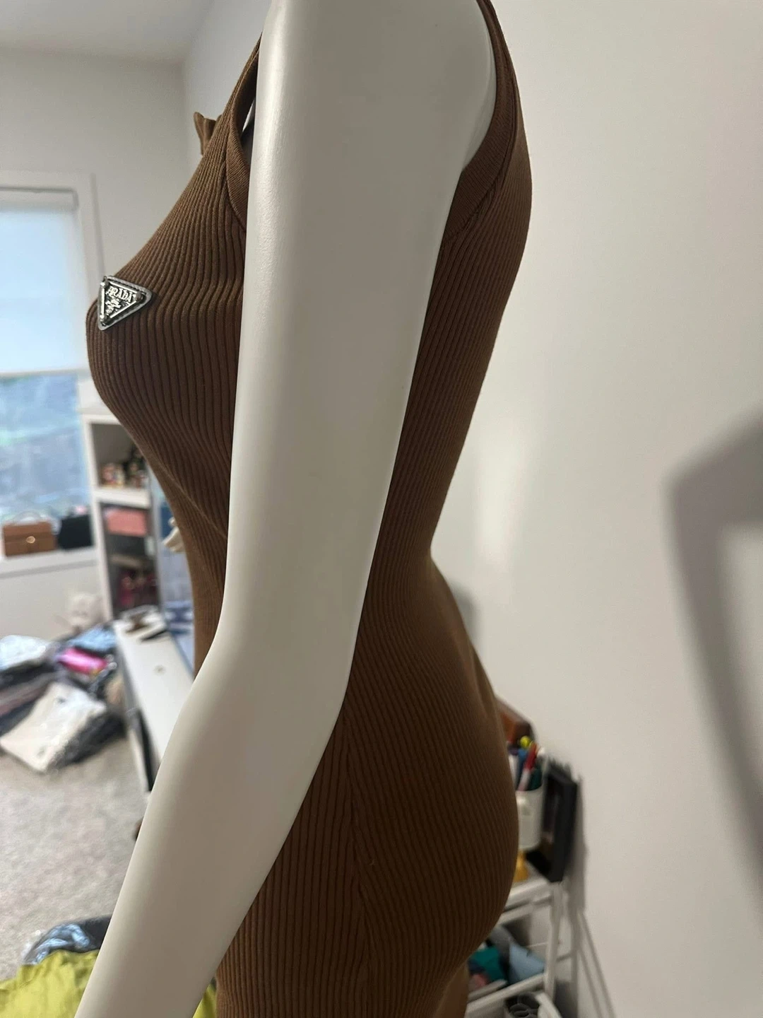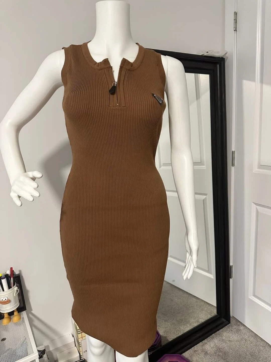 A brown, ribbed, sleeveless dress with a zipper at the neckline. It features a small triangular logo on the chest. This dress is designed for a form-fitting silhouette.