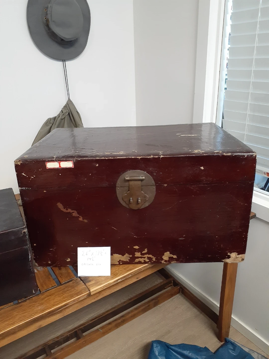 This is a vintage wooden storage trunk with a dark red finish and metal latch. It measures 26" x 17 1/2" x 14". This trunk would be useful for storing linens or blankets.